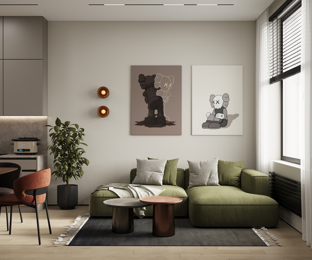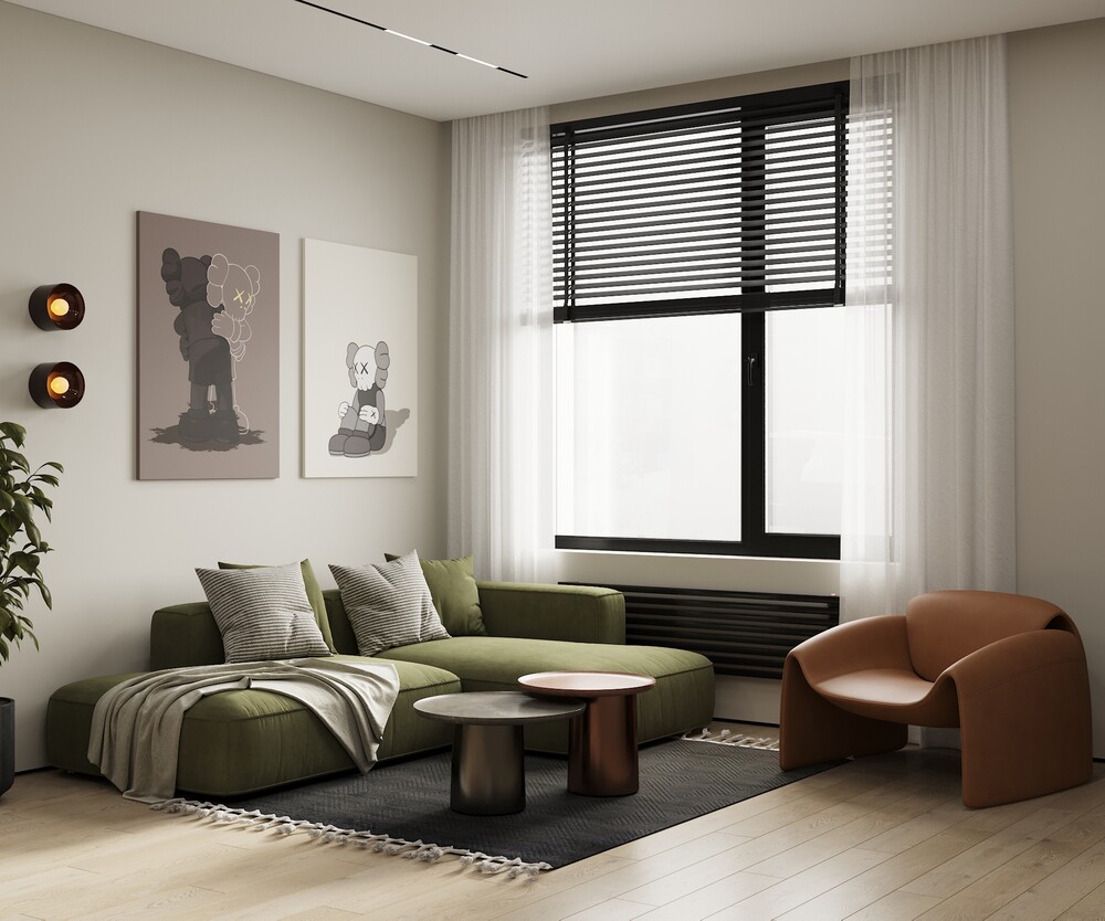 На фоне нейтральных стен выделили зону отдыха зеленым диваном и графичными постерами. Кресло терракотового оттенка и скрытые системы хранения завершают обустройство комнаты.