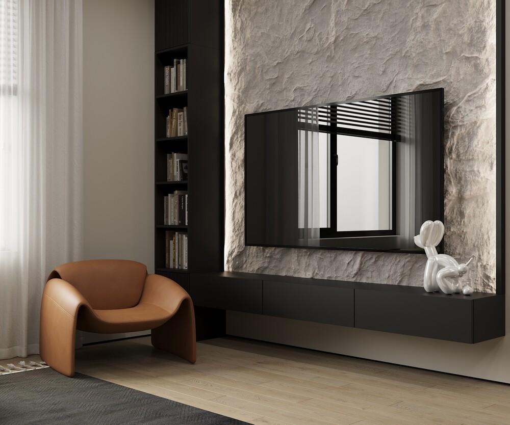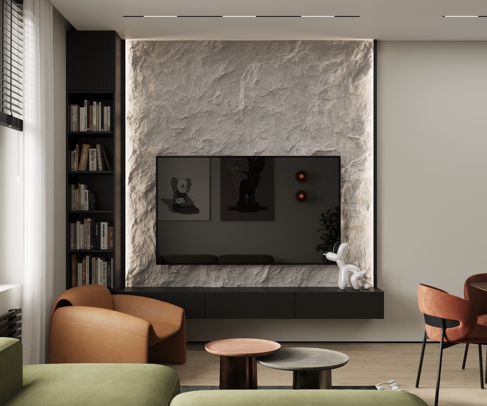 Общая зона получилась открытой, с четким разделением функций за счет мебели и света. Главная деталь здесь — стена с каменной фактурой, которая за счет контурной подсветки выглядит объемно и массивно. Под телевизором разместили длинную подвесную консоль, которая кажется невесомой и не загромождает пол.