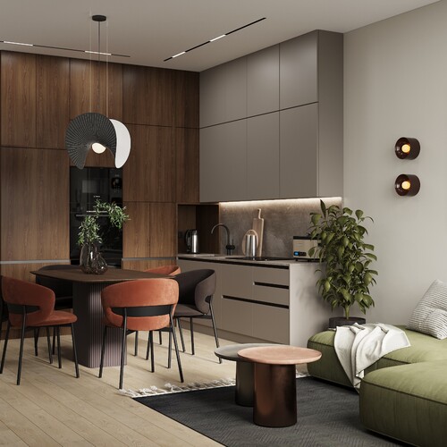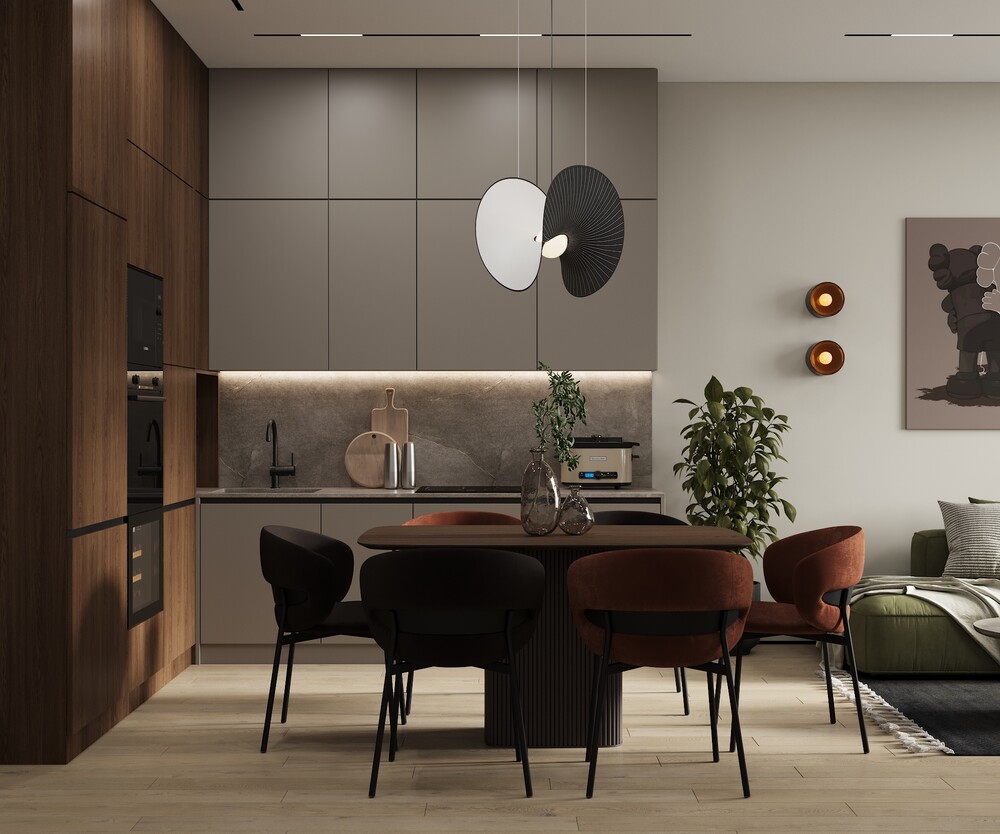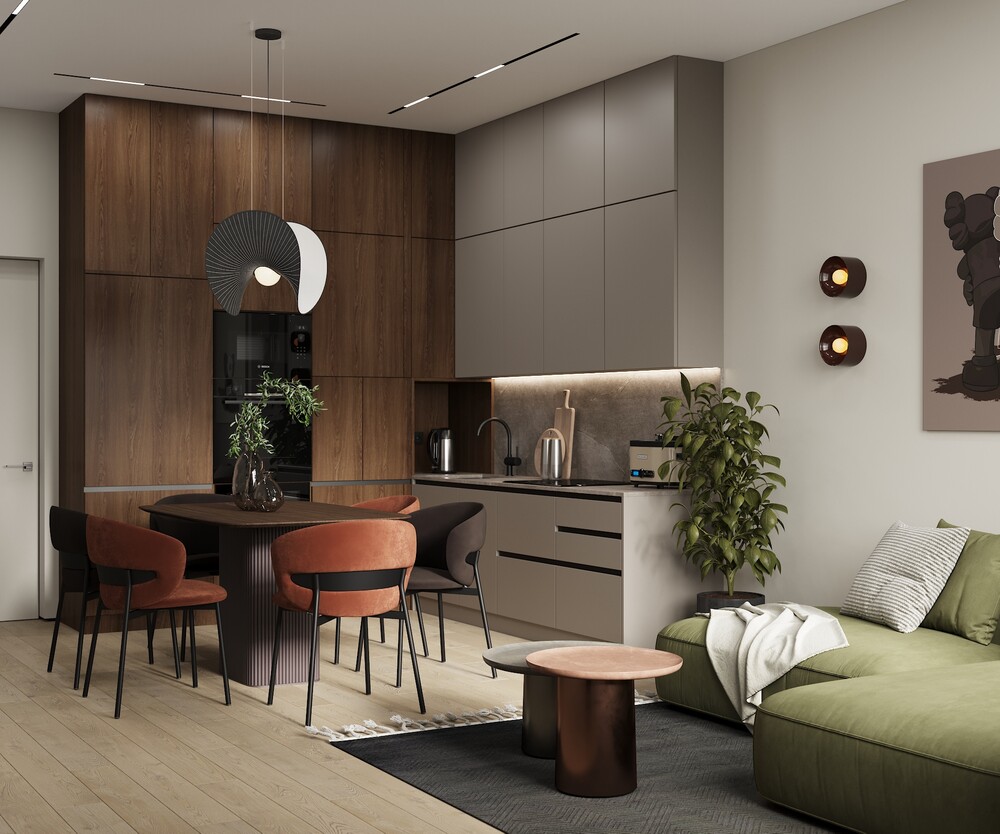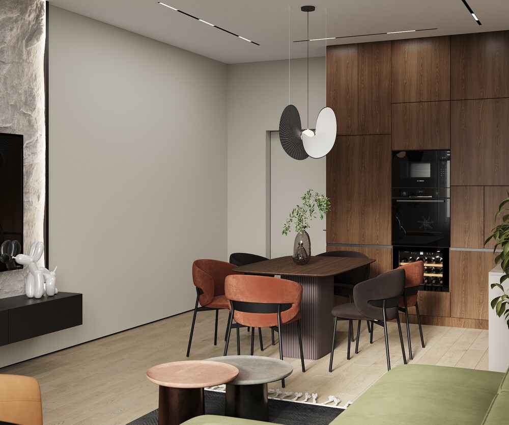 Интерьер выполнен в современном стиле с элементами неоклассики и ар-деко. Цветовая база построена на молочно-белых и теплых серых оттенках, которые делают пространство светлее и визуально просторнее. Синие, зеленые и розовые акценты добавлены через мебель и декор, чтобы сохранить цельность оформления.