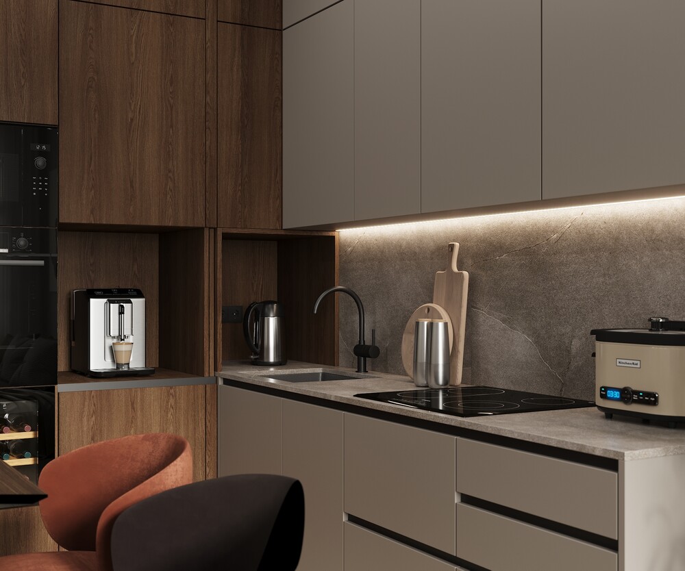 Для кофемашины предусмотрели специальный отсек с дверцей, которая уходит вглубь корпуса при открытии. Рабочую поверхность подсветили диодной лентой, создав комфортные условия для готовки.