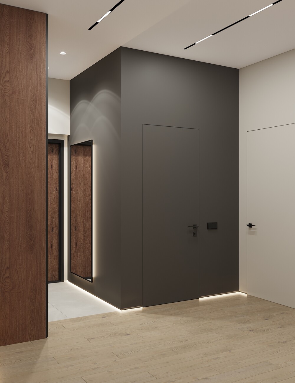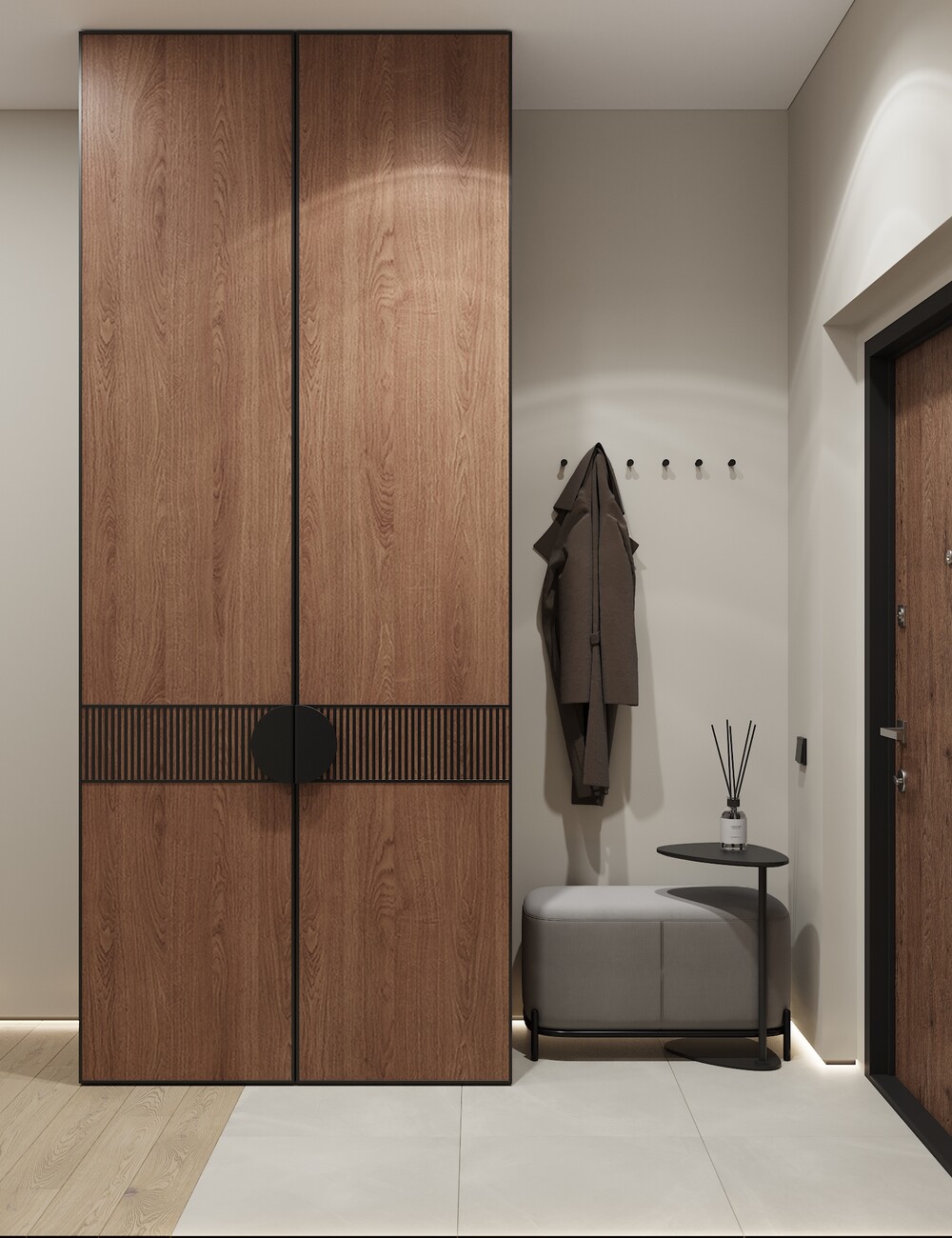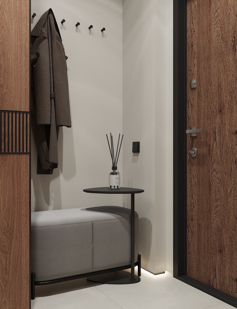 Входная зона выполнена в сочетании графитовых поверхностей и деревянных вставок. Вместительный шкаф до потолка скрывает не только одежду, но и док-станцию для робота-пылесоса. Поставили мягкую банкетку и нишу с зеркалом, которая визуально «пробивает» стену.