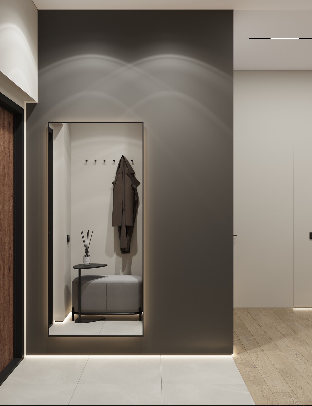 Ростовое зеркало в прихожей — монтаж полотна на всю высоту стены позволил вдвое визуально увеличить пространство.