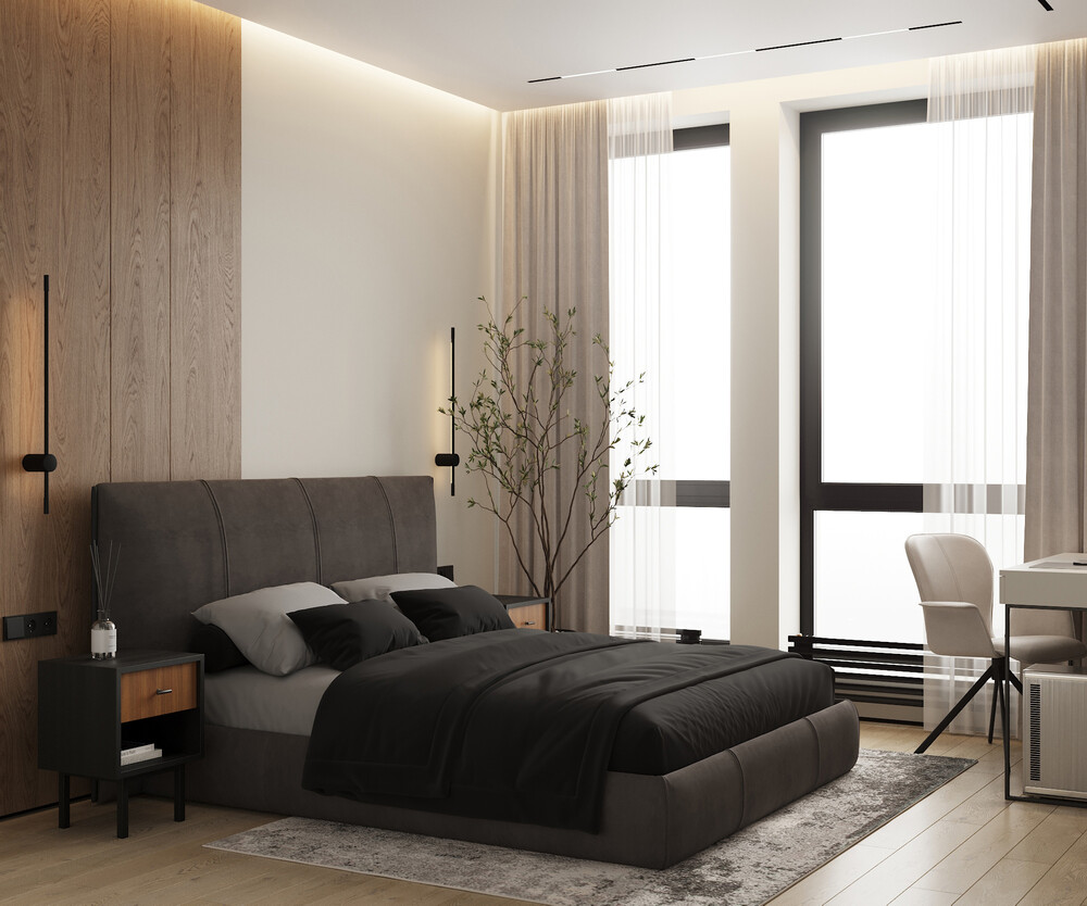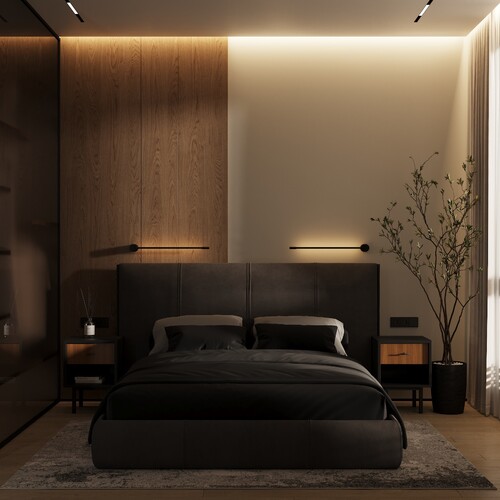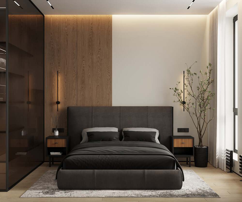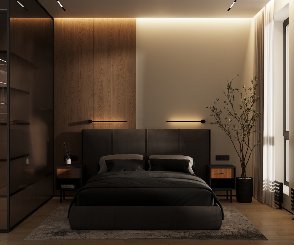 Интерьер спальни строится на контрасте светлого дерева и темной мягкой обивки кровати. Стена за изголовьем оформлена декоративными панелями со встроенным светом для создания глубины.