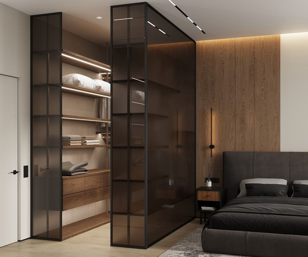 Интегрировать в спальню прозрачный гардеробный блок с внутренней подсветкой.