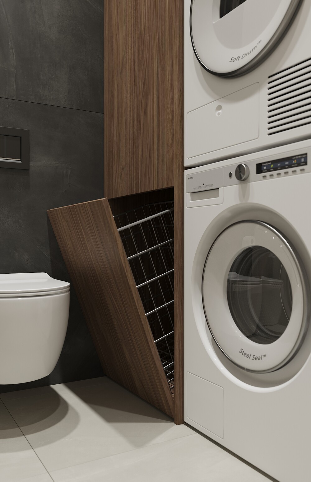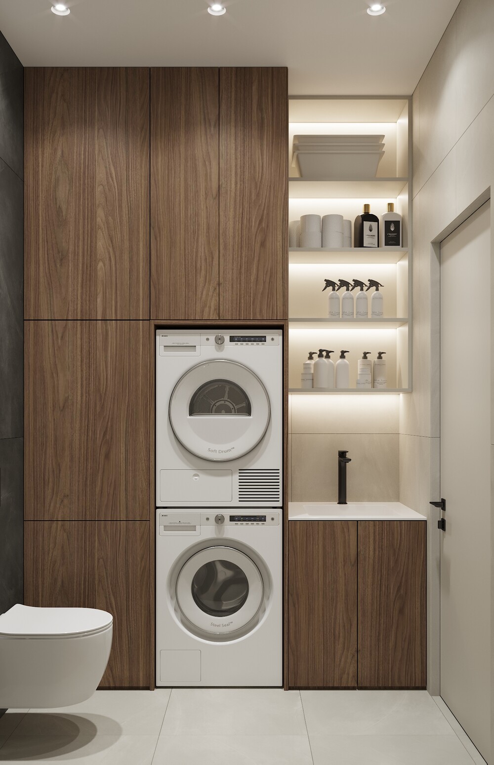 В нижней части предусмотрели удобный выдвижной ящик для сортировки белья перед стиркой. Открытые полки с мягким светом используют для хранения бытовых средств, а черная сантехника связывает зону с основным дизайном.