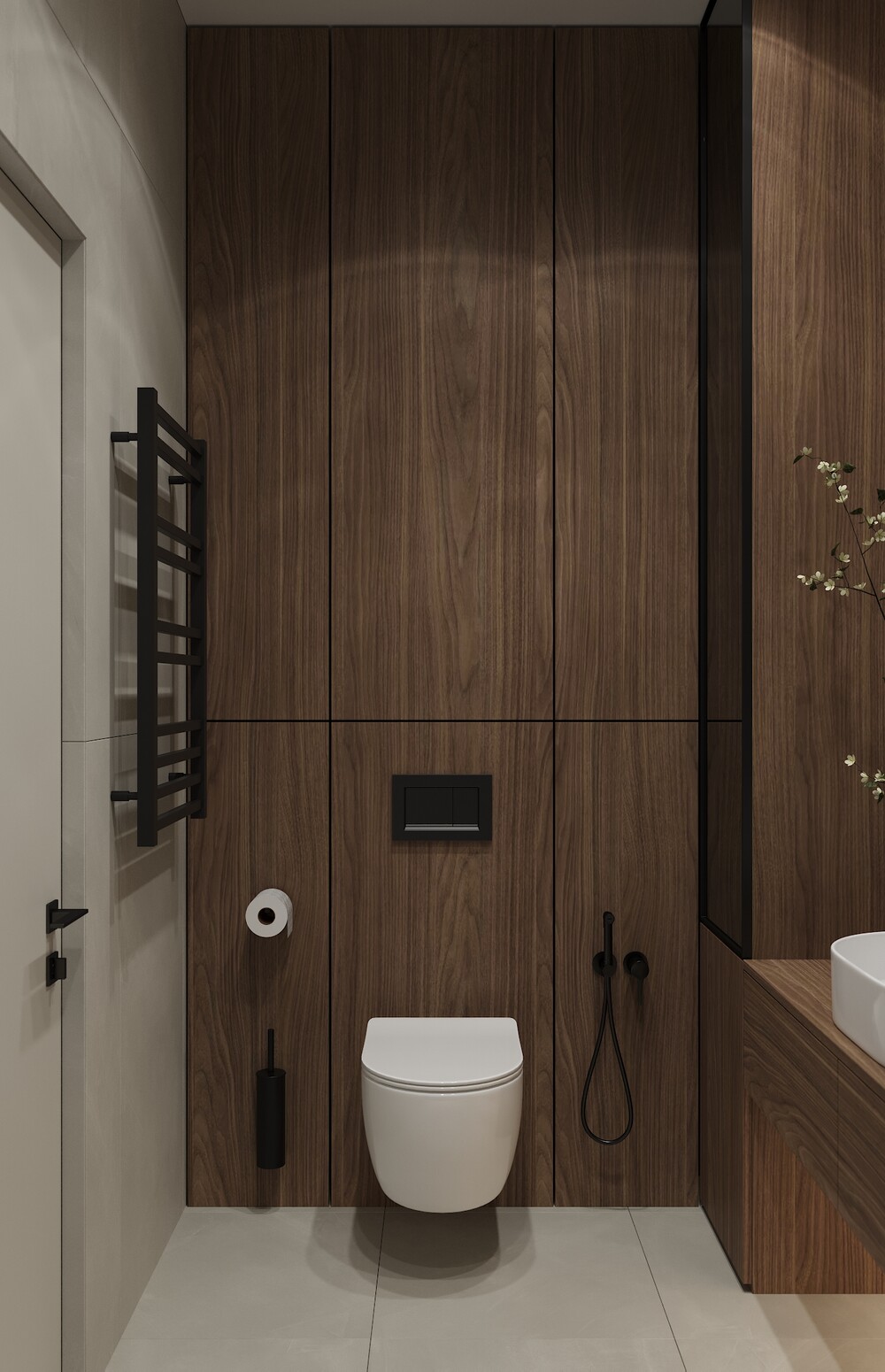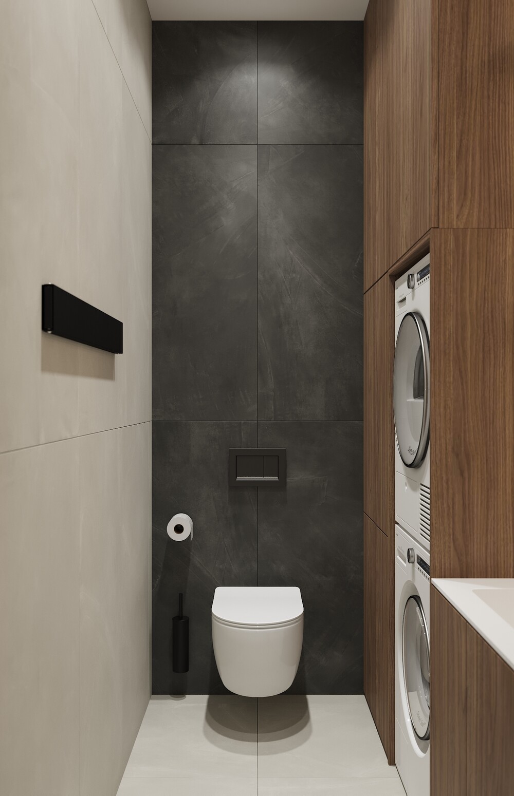 Второй санузел мы превратили в функциональный хозяйственный блок. Стиральную и сушильную машины спрятали в шкаф с фасадами под орех, сохранив единство стиля.