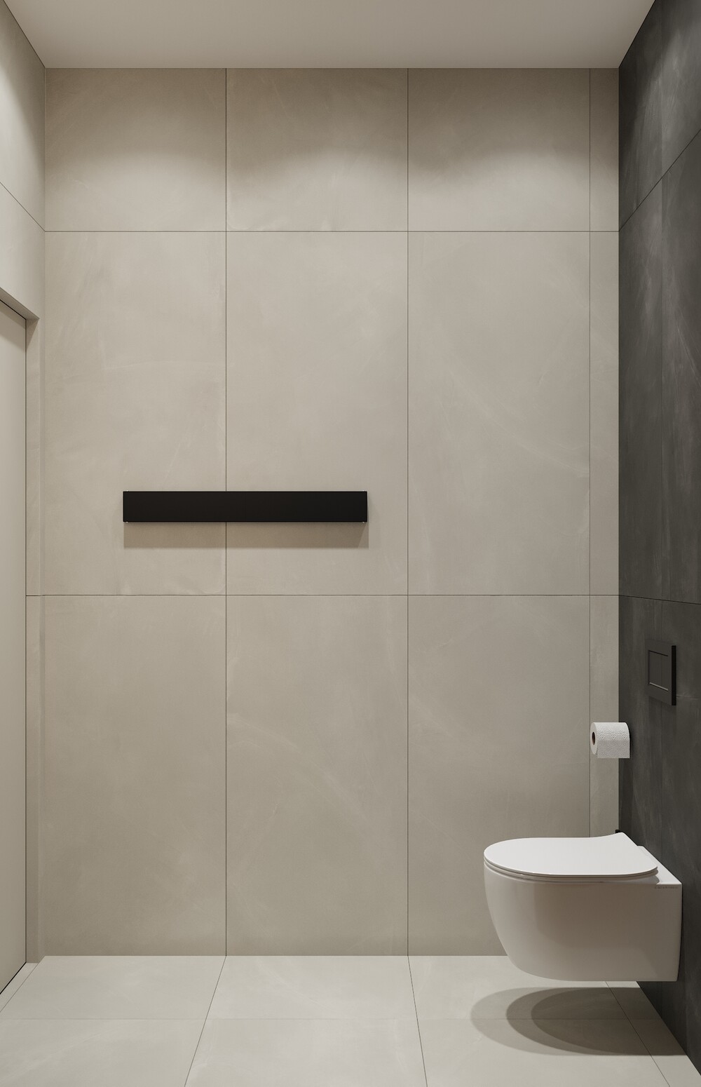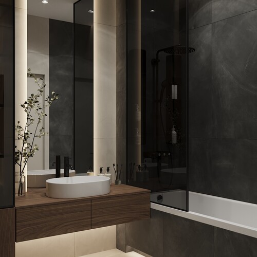 Для отделки выбрали крупноформатный керамогранит с текстурой камня и дерева. Подвесная тумба с накладной раковиной выглядит легко, а большое зеркало со светом по периметру меняет восприятие пространства.