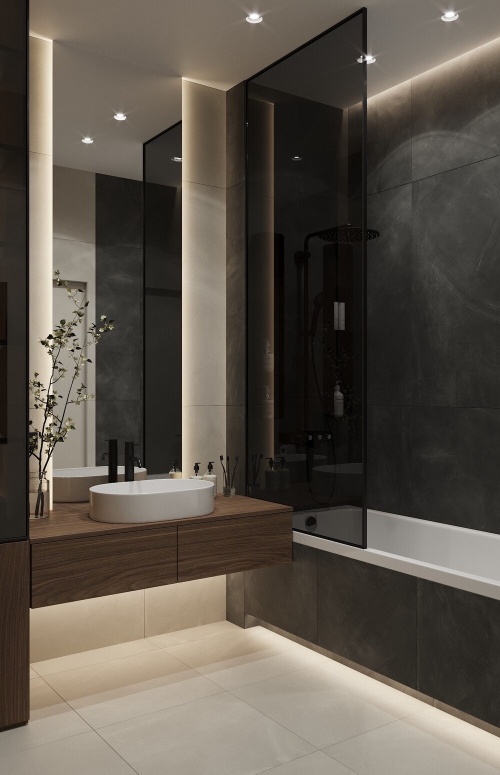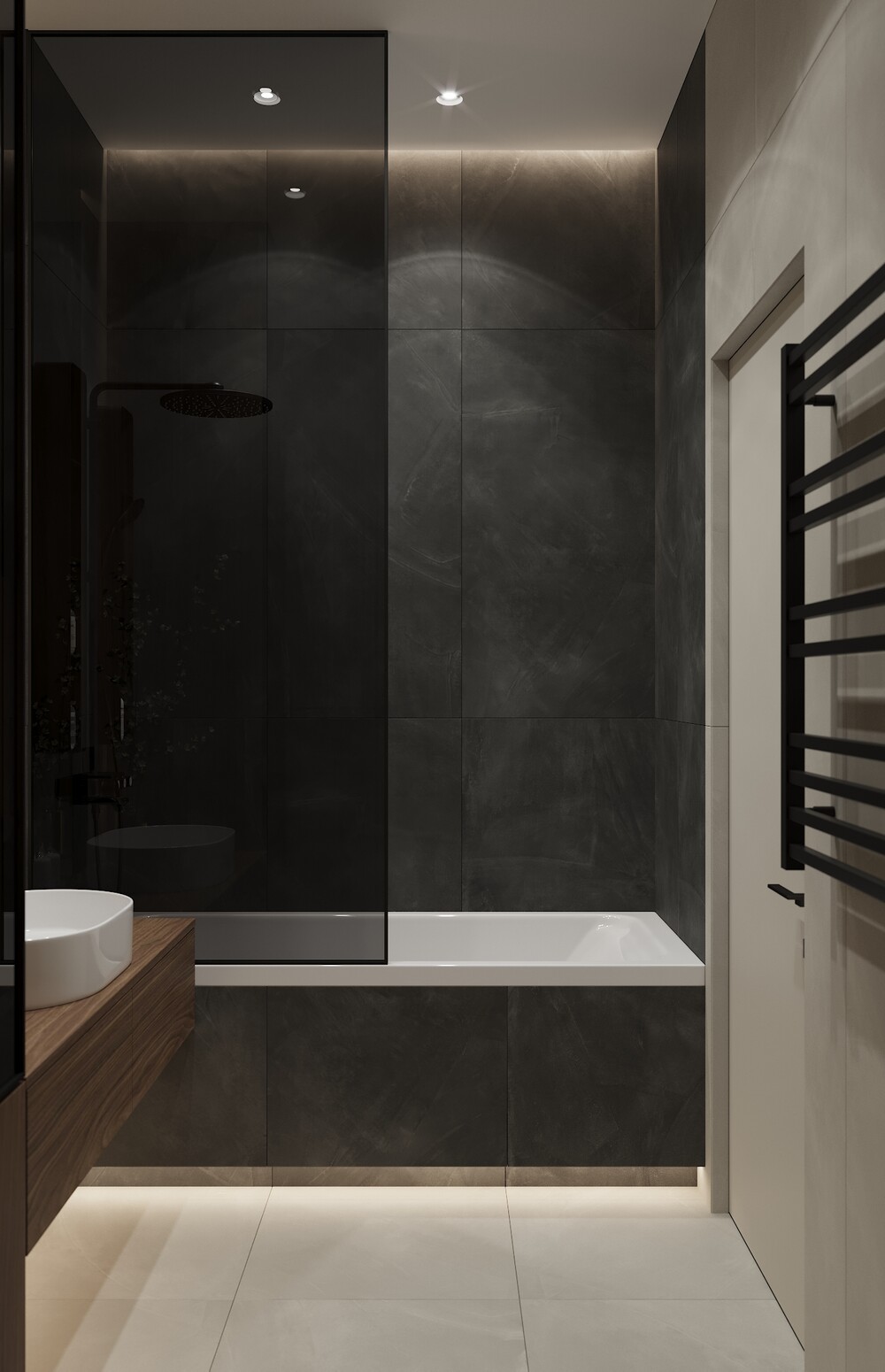 Душевую зону отделили темным стеклом, а смесители и аксессуары подобрали в черном матовом исполнении для поддержки графичности.