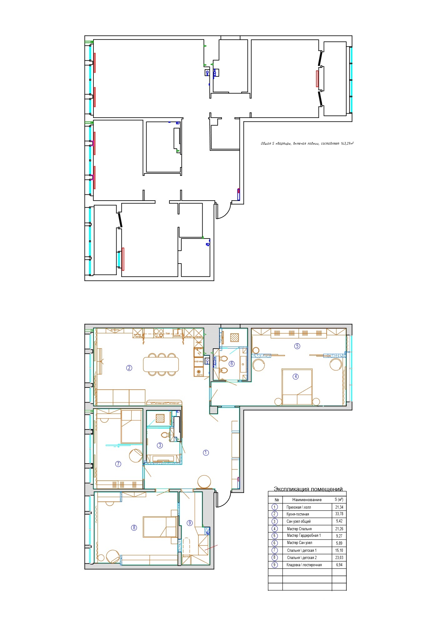 Мы провели перепланировку, демонтировав перегородки из пеноблоков для объединения жилых комнат с лоджиями, что существенно увеличило полезную площадь. Входную группу превратили в просторный открытый холл, плавно перетекающий в кухню-гостиную, а системы хранения интегрировали вдоль стен для визуальной чистоты. Благодаря переносу границ, в квартире удалось выделить полноценную мастер-зону с вместительной гардеробной и сохранить приватность детских спален.