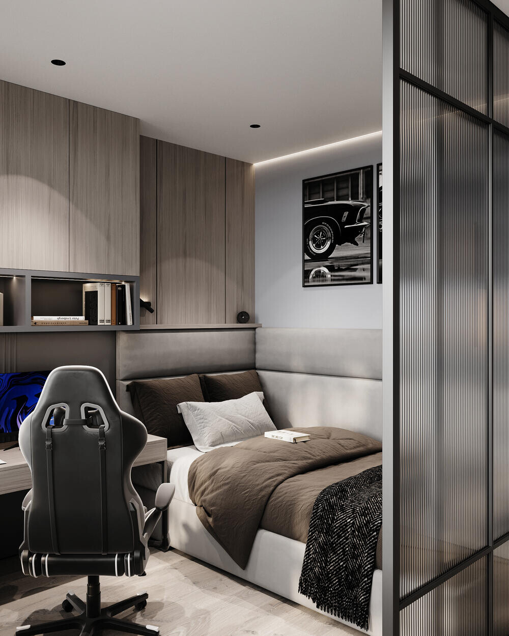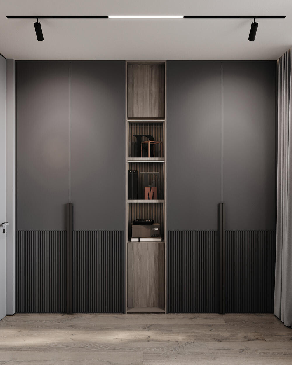 В этой комнате мы использовали светлую базу, дополнив её графитовыми акцентами и деревянными панелями в отделке стен. Спальное место с серым мягким изголовьем встроили в нишу между глубокими шкафами для хранения вещей.