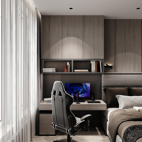 Кровать поставили в нишу между шкафом и раздвижной перегородкой. Возле окна установили рабочий стол, переходящий в стеллаж. Внутри него предусмотрели встроенную подсветку полок, что позволило освободить комнату от массивных шкафов и сохранить ощущение простора.