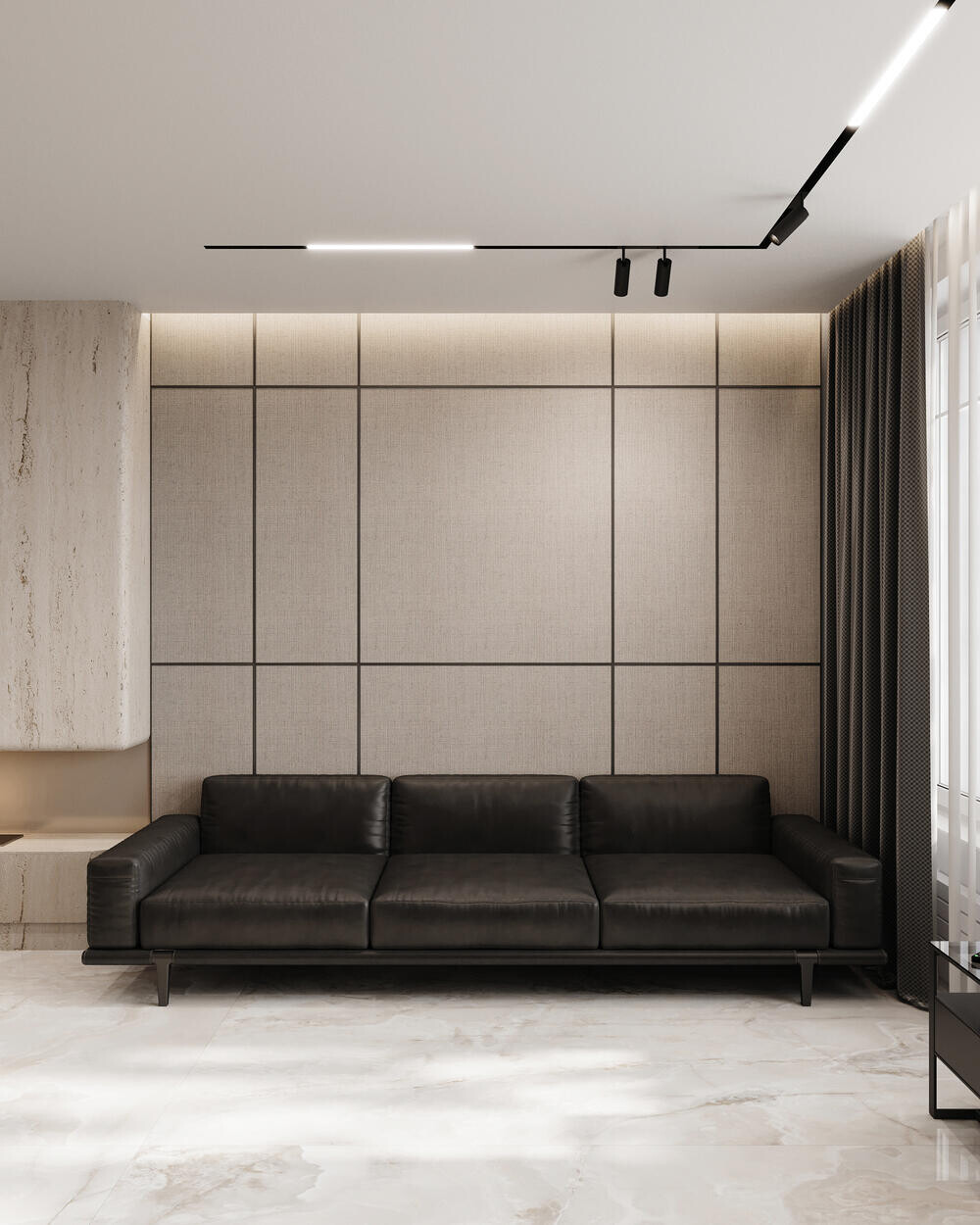 В зоне гостиной мы установили лаконичный кожаный диван темного цвета на фоне акцентной стены из текстильных панелей. Напротив него разместили встроенный стеллаж с прозрачными витринами, который оснастили скрытой вертикальной подсветкой.