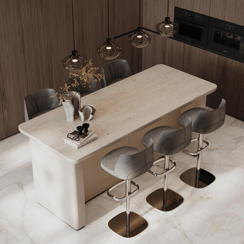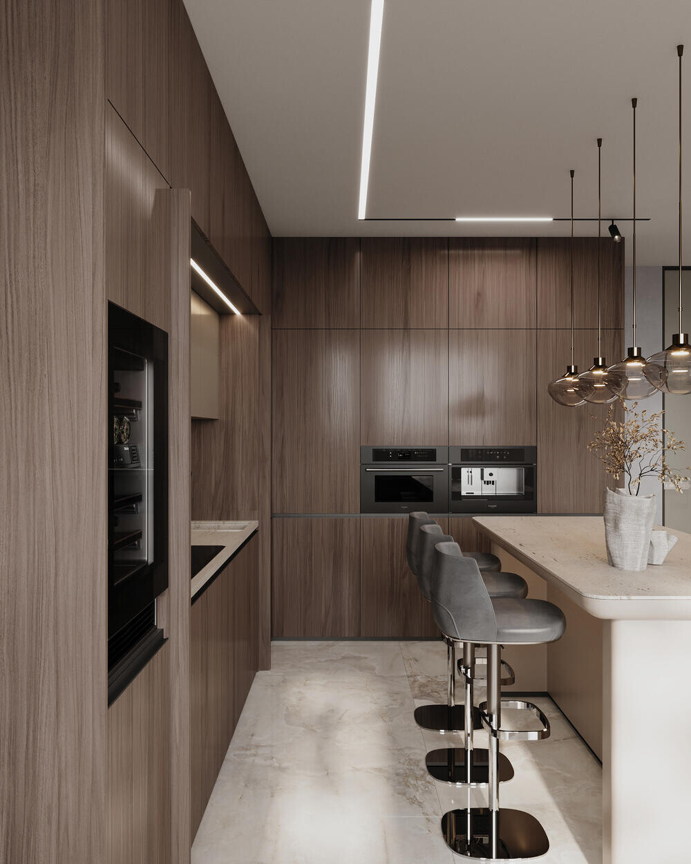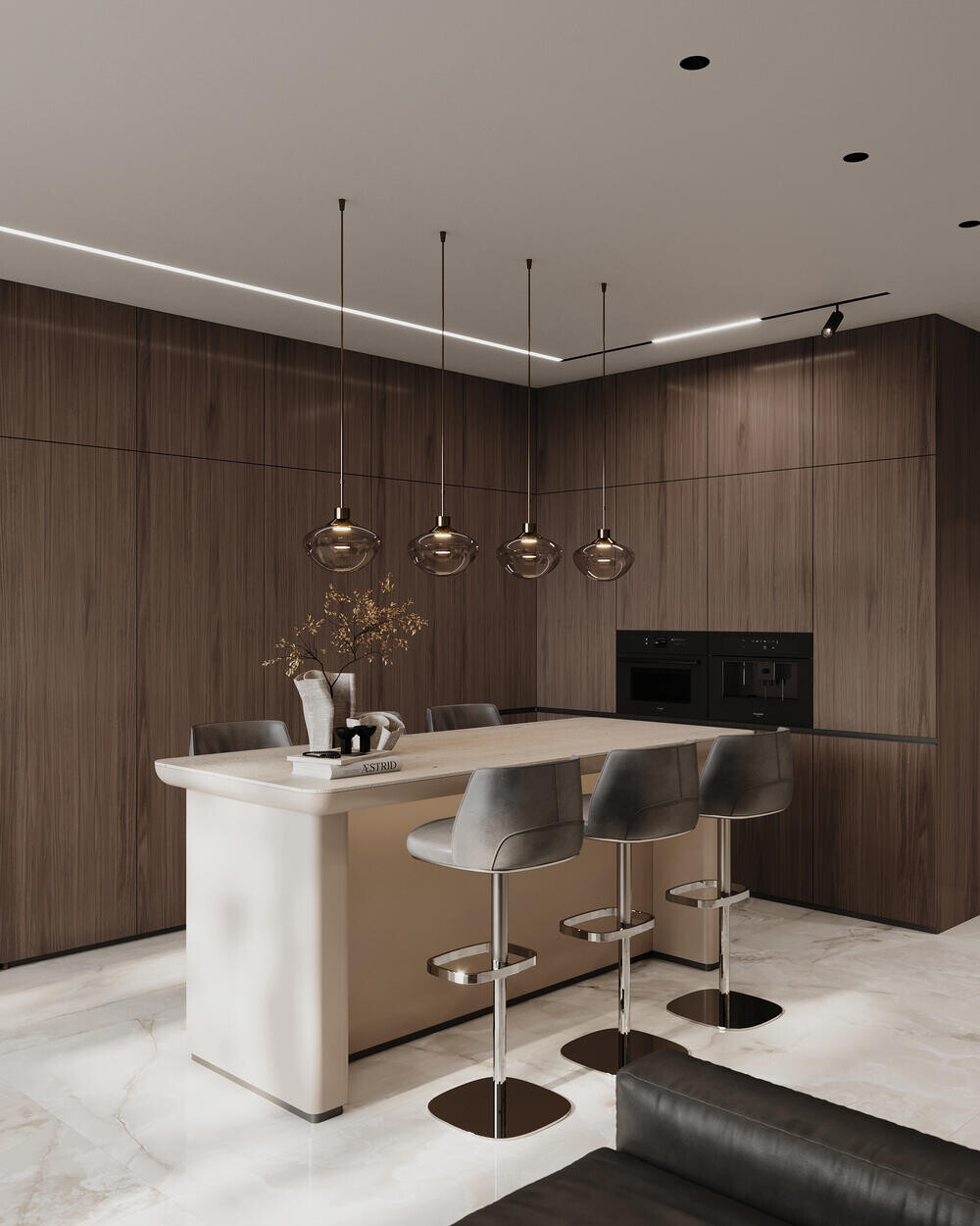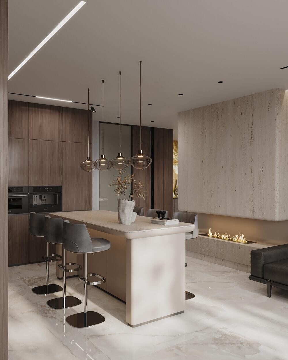 Фартук и столешницу выполнили из светлого камня с пористой текстурой, дополнив рабочую зону скрытой светодиодной полосой. В торец кухонного стеллажа интегрировали винный шкаф, а над островом установили ряд подвесных светильников из тонированного стекла.