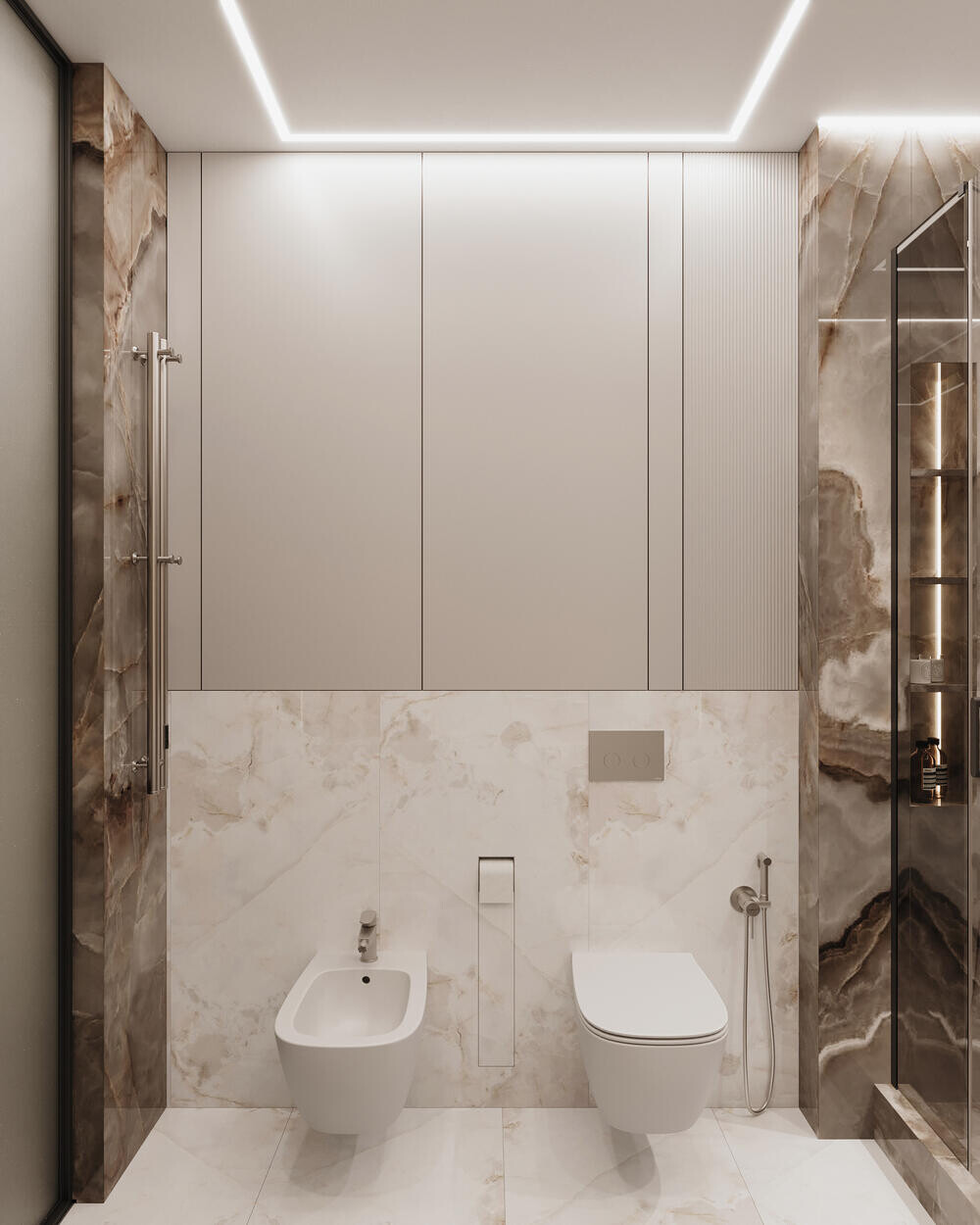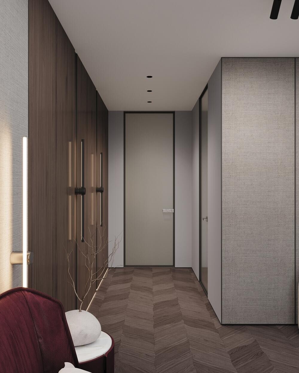 Главным украшением зоны стала глубокая ниша из подсвеченного камня с изящным комодом и авторской скульптурой. Пол выложили крупноформатным керамогранитом, а потолок оснастили магнитными треками для четкой геометрии света.