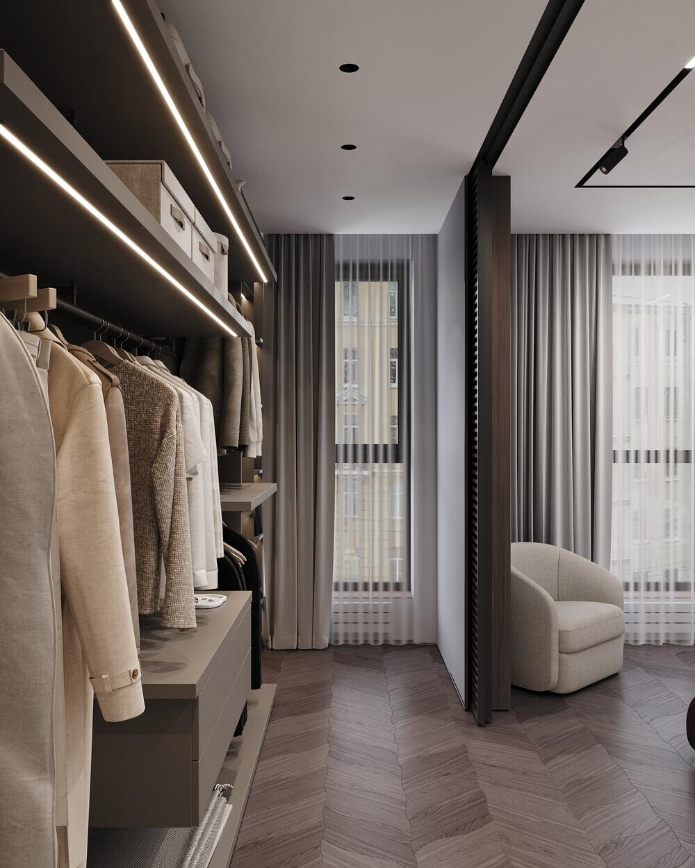 Просторную гардеробную мы вынесли в отдельную зону и отделили от спального места раздвижными реечными перегородками из темного металла. Системы хранения оснастили открытыми полками, встроенной подсветкой штанг и полноростовым зеркалом в скругленной раме для удобства примерки.