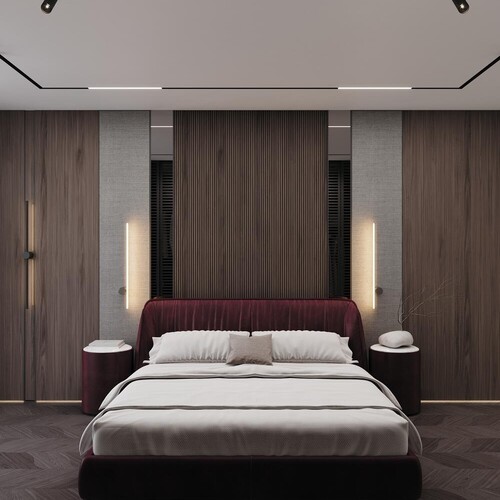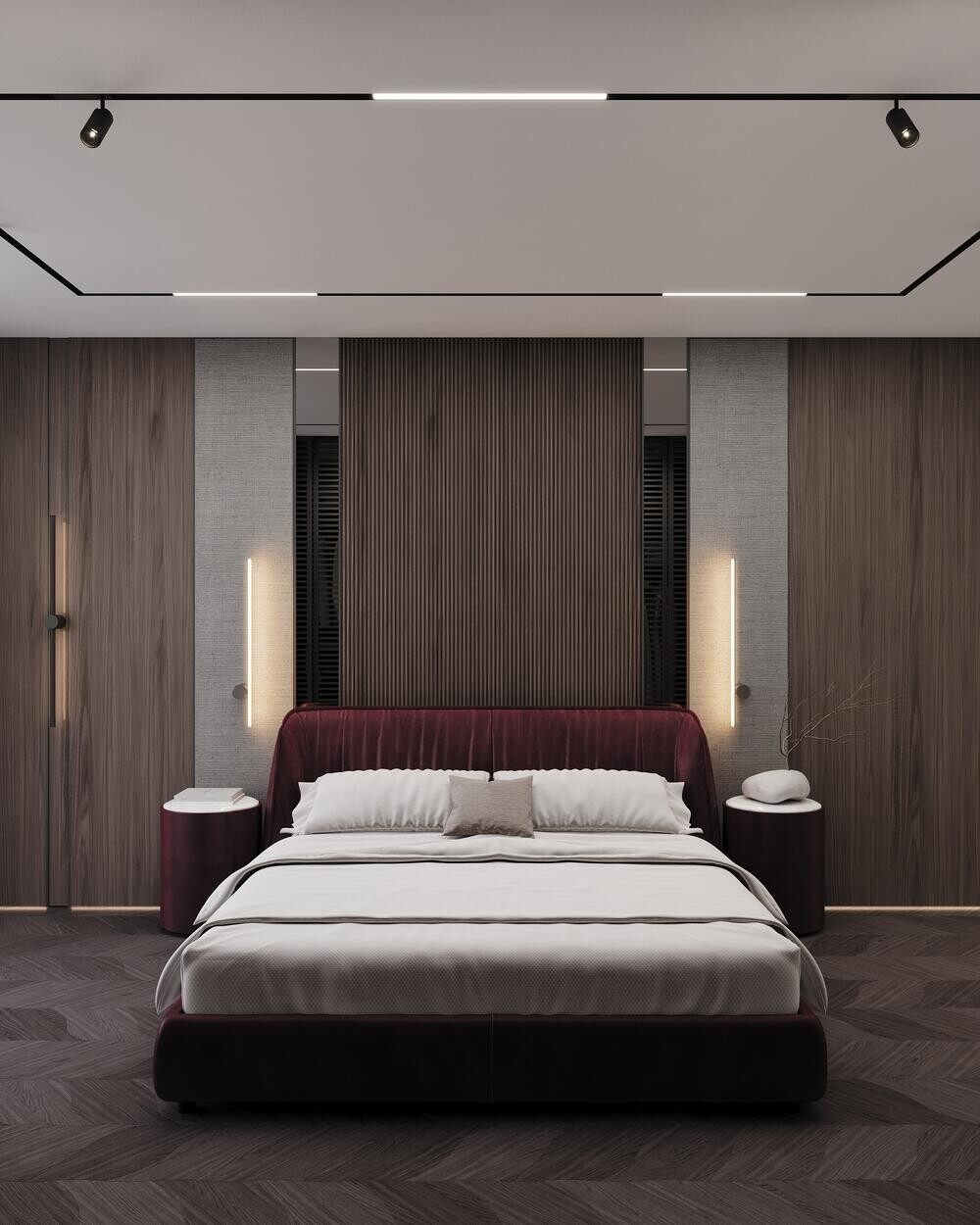 Центром мастер-спальни стала кровать с массивным мягким изголовьем в глубоком бордовом цвете, установленная на фоне рельефных деревянных панелей. Стену за кроватью дополнили зеркальными вставками и тонкими вертикальными светильниками, которые создают графичный световой рисунок.