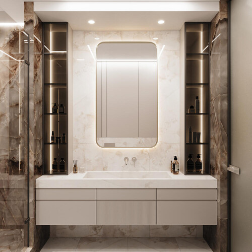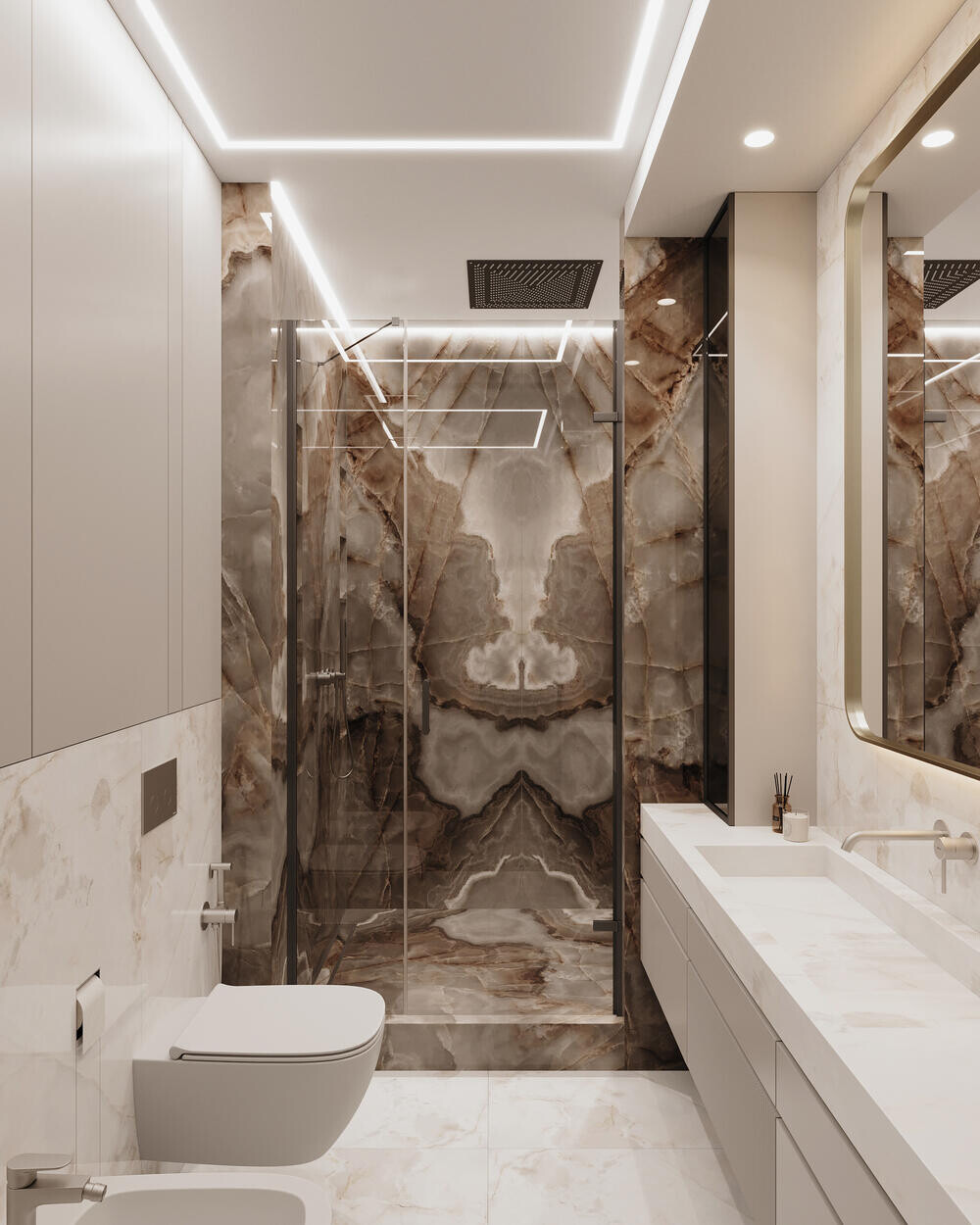 Просторную душевую зону выделили прозрачной стеклянной перегородкой, сохранив визуальный объем и единство отделочных материалов. Широкую тумбу с раковиной дополнили большим зеркалом, которое скрывает за собой мягкую контурную подсветку.
