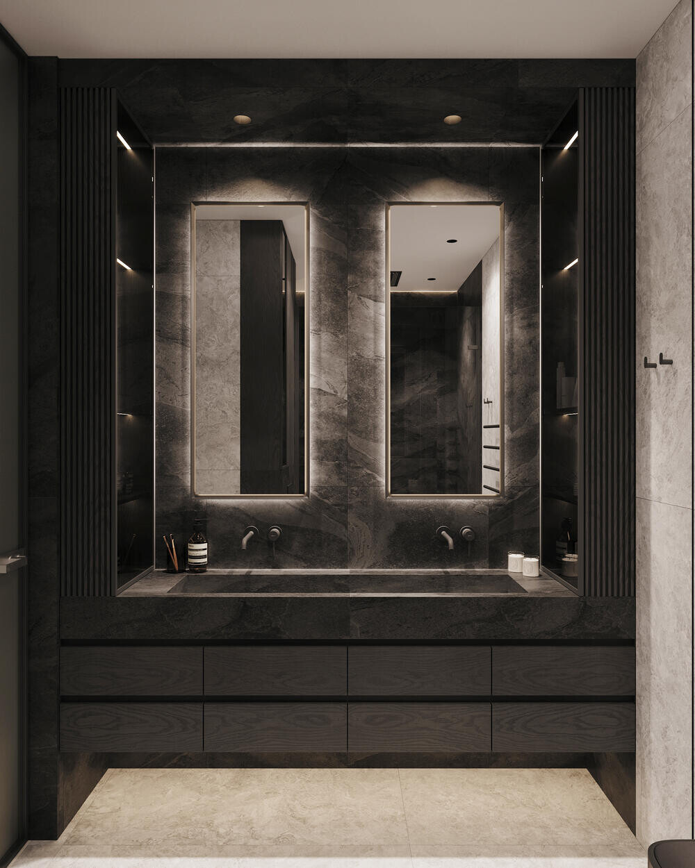 Мастер-ванную мы расположили в приватной зоне квартиры рядом со спальней. Стены и пол здесь облицевали темным керамогранитом с активной каменной текстурой, подчеркнув камерную атмосферу помещения.