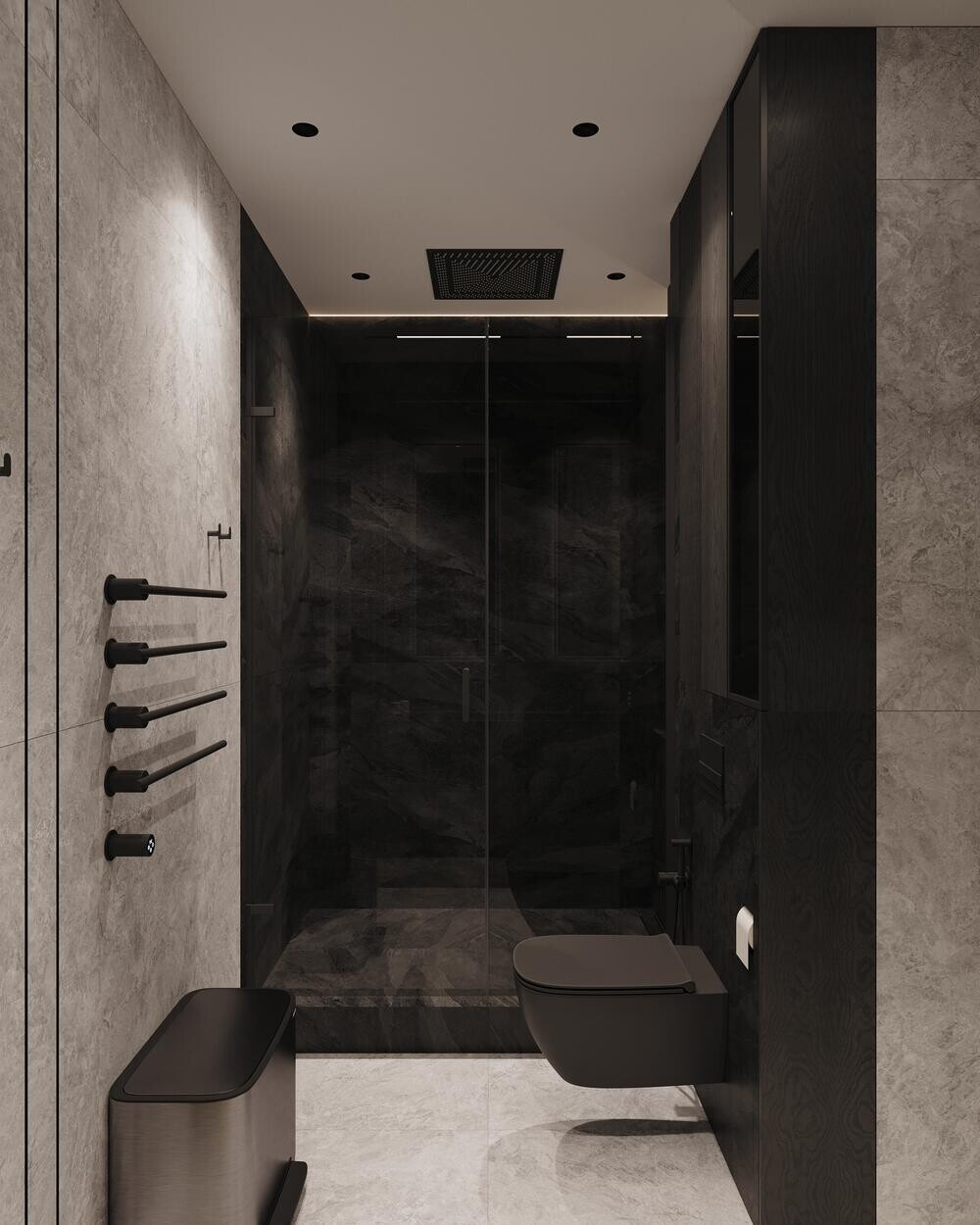 Душевую зону выделили прозрачной стеклянной перегородкой и установили встроенные полки с мягким светом для банных принадлежностей. Черная сантехника и лаконичные аксессуары поддерживают современный стиль интерьера и камерную атмосферу помещения.
