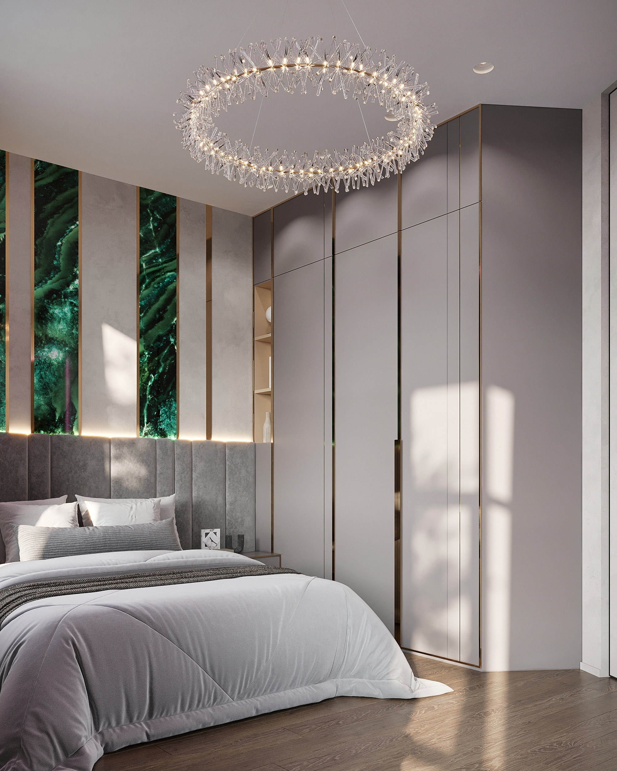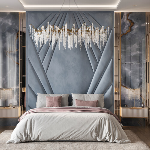 Здесь всё заточено под отдых. Главный акцент — мягкое изголовье кровати во всю стену, дополненное зеркалами для симметрии. Вместо яркого света использовали несколько уровней подсветки: бра, настольные лампы и люстру в форме ветвей, которая превращает потолок в арт-объект.
