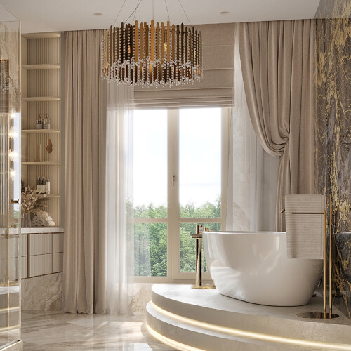 Центр притяжения — отдельно стоящая ванна на подиуме напротив панорамного окна. Можно принимать ванну и рассматривать город. Стены оформили мрамором с золотыми прожилками в сочетании с лаконичными золотыми смесителями. Завершает образ необычная подвесная люстра.