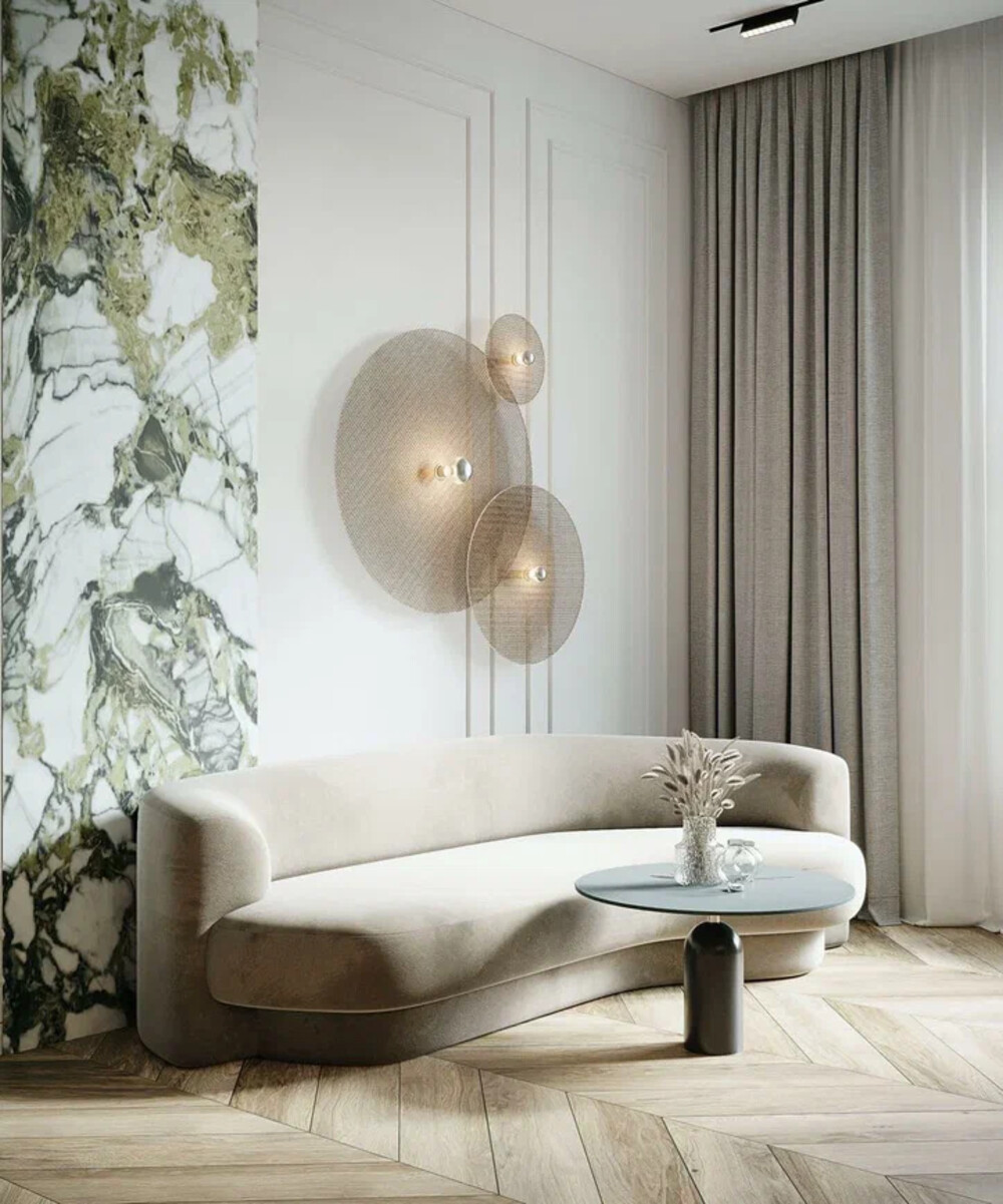 Центральное место занимает круглый обеденный стол с мягкими креслами — решение выглядит лёгким и универсальным. Гостиная зона сформирована вокруг дивана с плавными линиями и компактных журнальных столиков. Освещение решено слоями: кольцевые люстры задают общее настроение, а настенные светильники добавляют мягкий вечерний сценарий.
