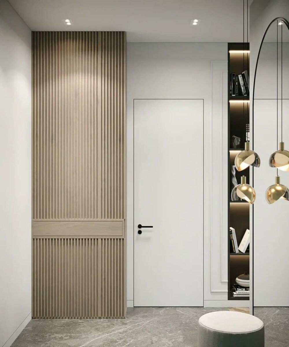 Прихожая оформлена в светлой, спокойной палитре с акцентом на текстуры и рельеф. Вертикальные деревянные рейки сочетаются с гладкими однотонными плоскостями, за счёт чего пространство выглядит структурным и аккуратным. Крупное зеркало в арочном обрамлении визуально расширяет зону входа и добавляет интерьеру глубины. Подвесные светильники с тёплым металлическим оттенком формируют мягкое рассеянное освещение и придают прихожей более торжественный характер.
