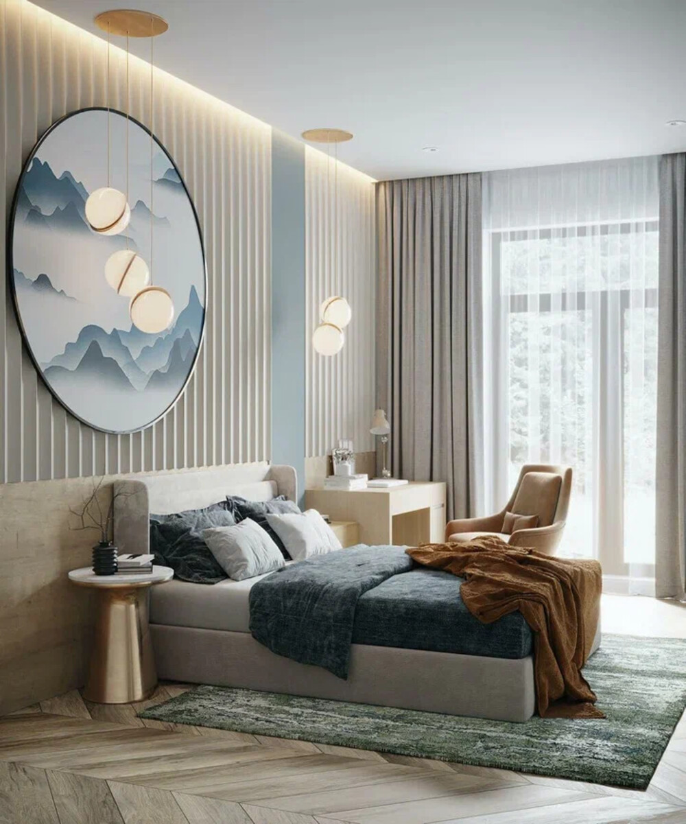 Круглое панно с графикой гор в спальне — становится акцентом и придаёт пространству индивидуальный характер.