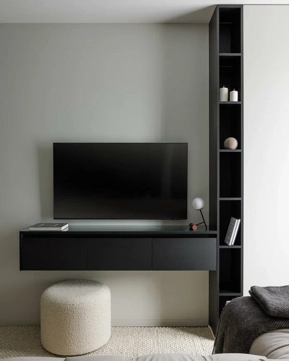 Гостиная построена вокруг мягкого дивана в светлой обивке. Низкая тумба и вертикальные встроенные модули формируют минималистичную строгость. Монохром разбавляют текстиль, тёплый рассеянный свет и натуральные фактуры.