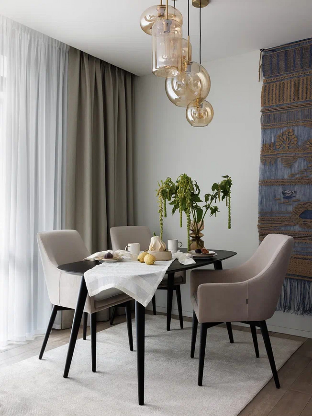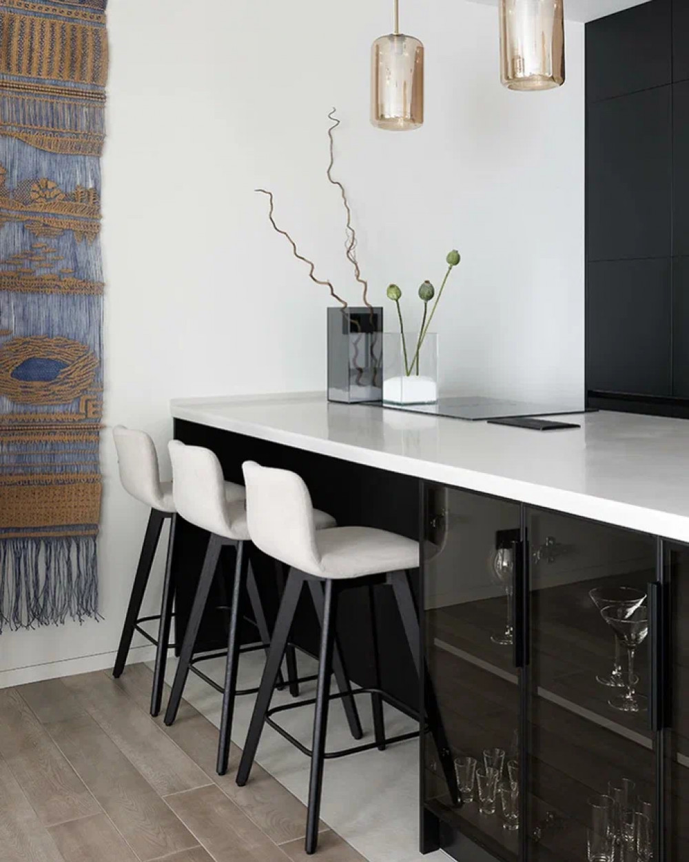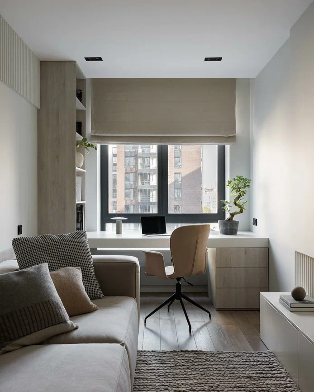 Кабинет задуман как универсальное пространство. Рабочий стол встроен у окна, чтобы получить естественного света для работы. Светлая палитра, дерево и текстиль создают спокойную атмосферу. Стеклянный шкаф с подсветкой добавляет глубины и служит декоративным элементом. Благодаря дивану кабинет легко трансформируется в гостевую комнату.