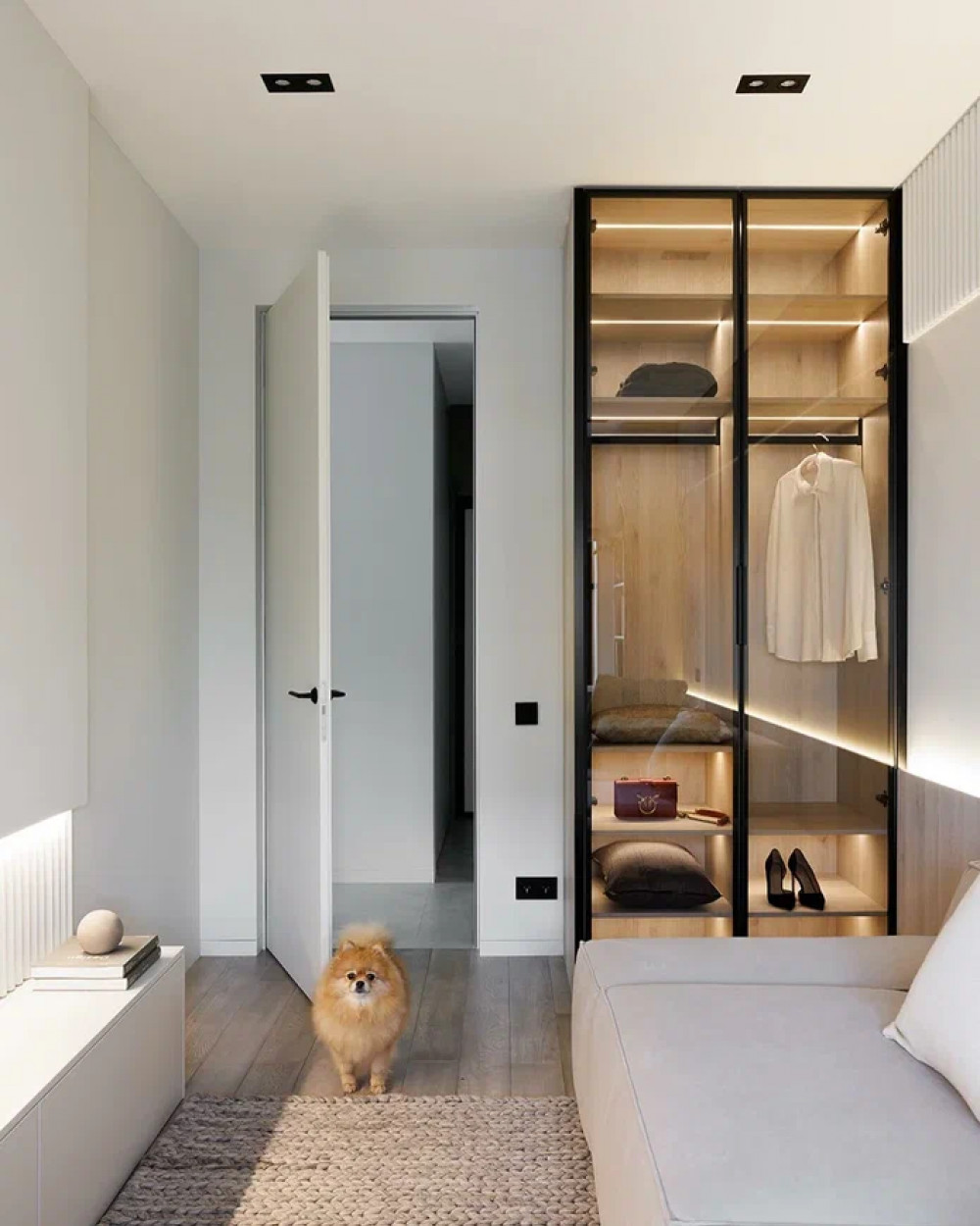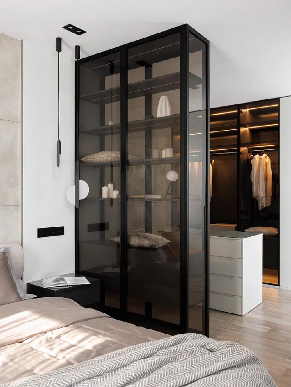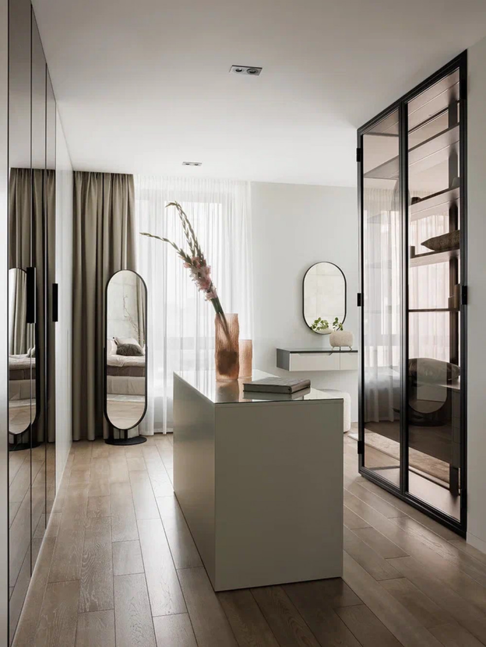 Графичность пространству придают чёрные элементы в светильниках и обрамлении зеркал. Гардеробная отделена стеклянной перегородкой с затемнением. Это решение сохраняет визуальную лёгкость мастер-блока и не дробит пространство. Внутри предусмотрены глубокие шкафы, остров с ящиками и открытые полки для часто используемых вещей.