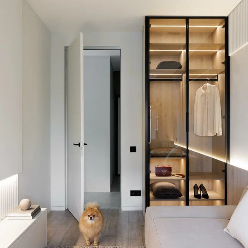 Стекло и затемнённые перегородки — используются в гардеробной и душевой, сохраняют ощущение открытого пространства и лёгкости.