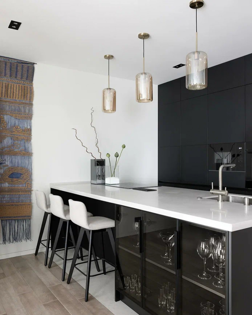 Кухня полностью встроенная — без классического гарнитура в привычном понимании. Техника интегрирована в шкафы, фасады лаконичные, монохромные. Основной рабочий сценарий вынесен на остров: здесь расположены плита, мойка и зона для быстрых завтраков.