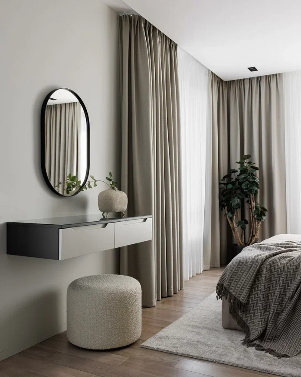 Лёгкая консоль, зеркало в потолок и компактный пуф формируют функциональную, но визуально лёгкую композицию. Скрытая подсветка усиливает ощущение объёма, а крупное растение добавляет живой акцент.