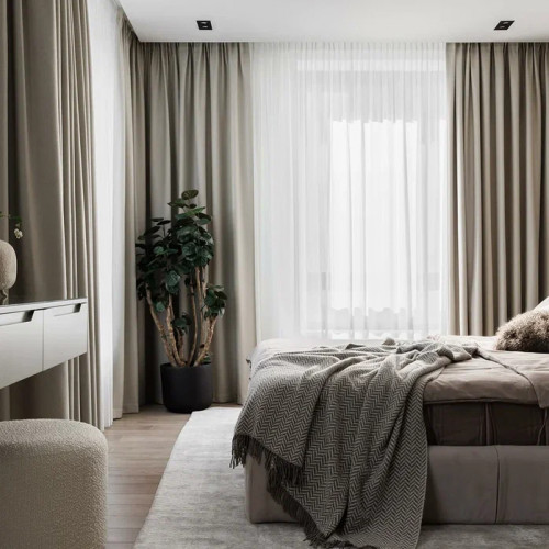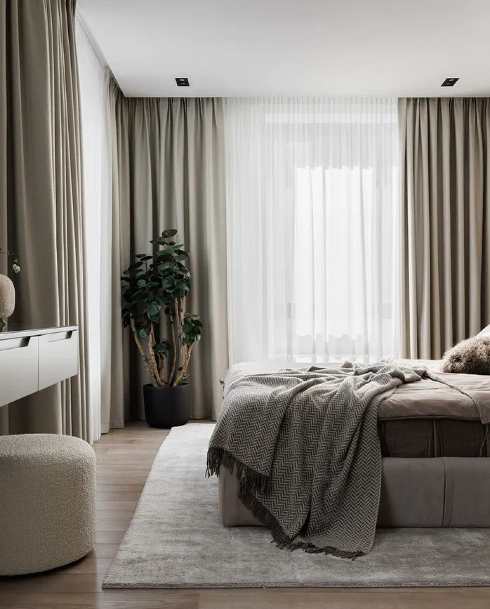 Спальня выстроена на нюансах фактур и света. Основной акцент — стена за изголовьем, оформленная крупноформатными панелями под штукатурку. Массивная кровать с мягкой обивкой и многослойным текстилем. У зеркала размещена встроенная консоль с пуфом — компактная зона для макияжа.