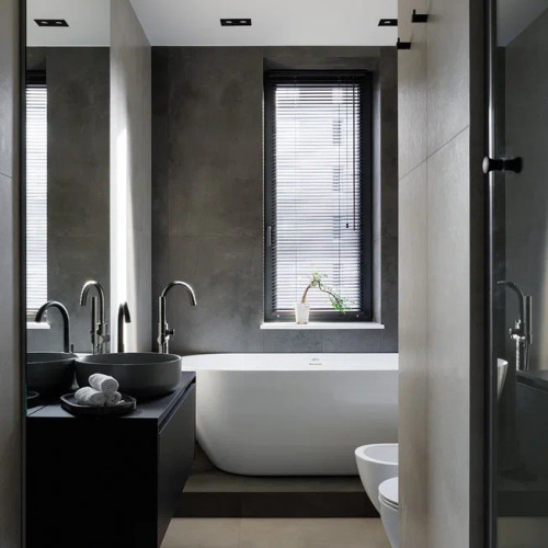 Цветовая база — тёплые серые оттенки и чёрная сантехника. Подсветка по периметру потолка и зеркал визуально увеличивает высоту помещения. Наличие окна наполняет ванную естественным светом — редкое и ценное решение.