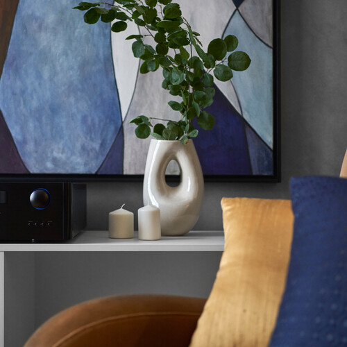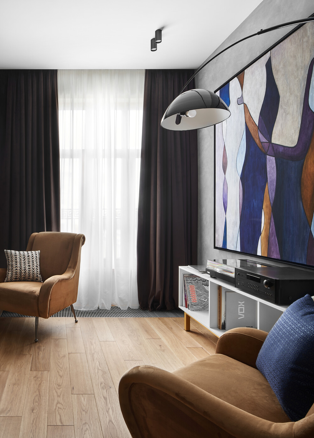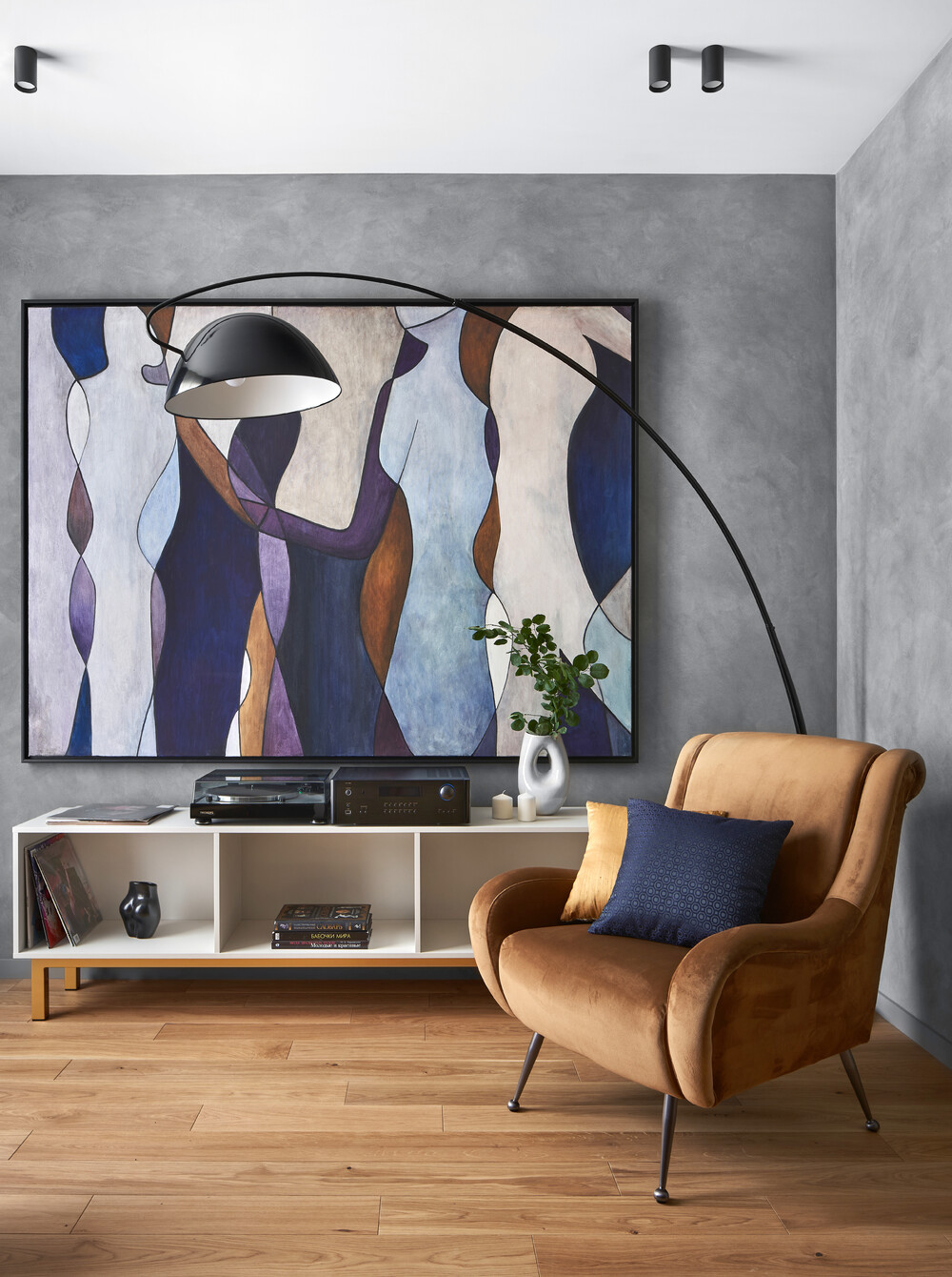 На стене висит абстрактная картина, которая поддерживает общую графику и стиль кабинета. Освещение здесь разделено на общее и локальное для комфортной работы за компьютером.
