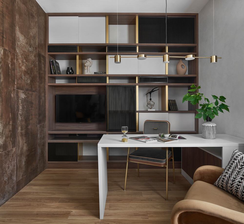 Комната оформлена в коричневых тонах с использованием выразительных материалов. Рабочий стол стоит напротив большой мебельной конструкции с полками и закрытыми секциями. В зоне отдыха мы поставили мягкое кресло и торшер дуговой формы для чтения.