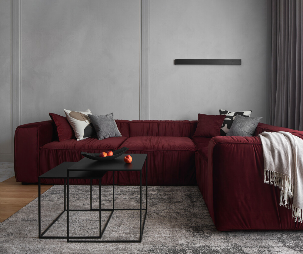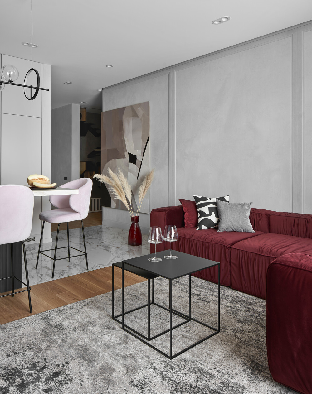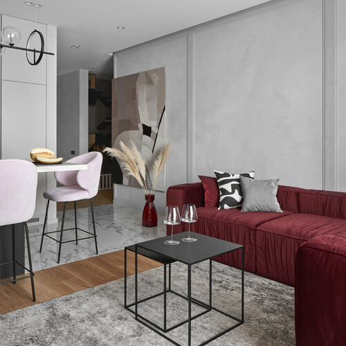 Пространство объединяет несколько функций, сохраняя при этом строгую геометрию. Главным цветовым пятном здесь стал большой бордовый диван на фоне серой отделки стен. Стена в ТВ-зоне оформлена бетонными панелями, открытыми нишами и ламелями.