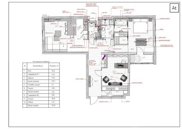 Планировочное решение разделяет квартиру на рабочую, общую и личную части. Кухня-гостиная стала центром, куда можно попасть из холла или кабинета. Спальню мы вынесли в отдельный блок, объединив её с ванной и гардеробной. Кабинет находится рядом со входом, чтобы рабочие звонки и дела не мешали тем, кто отдыхает в гостиной. Холл остался свободным от лишних вещей благодаря отдельной гардеробной для верхней одежды.