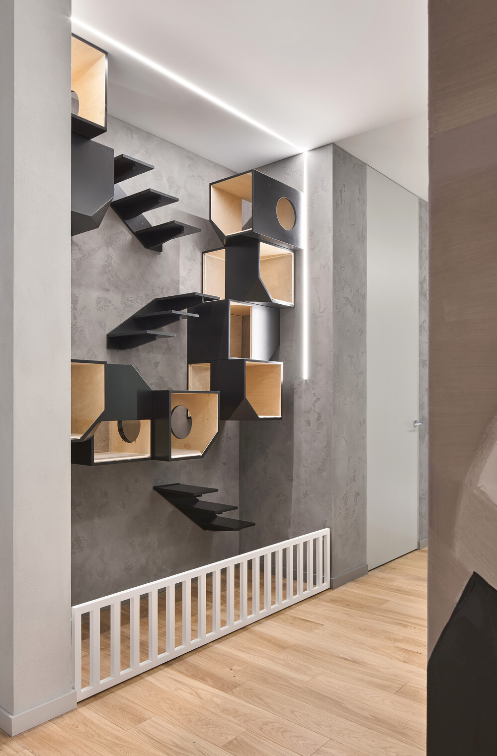 Входная зона выделена износостойкой каменной плиткой, которая стыкуется с деревянным полом коридора. Зеркало в полный рост расширяет узкое пространство и отражает свет от ламп. Мы спроектировали специальный модуль для кошек с переходами и ступенями на стене.