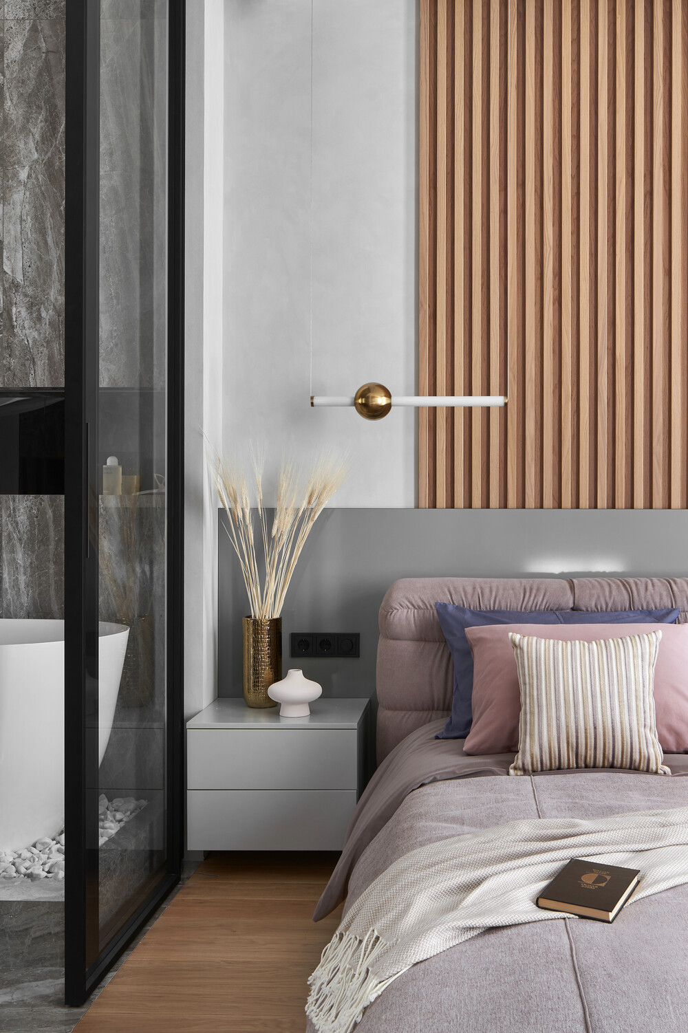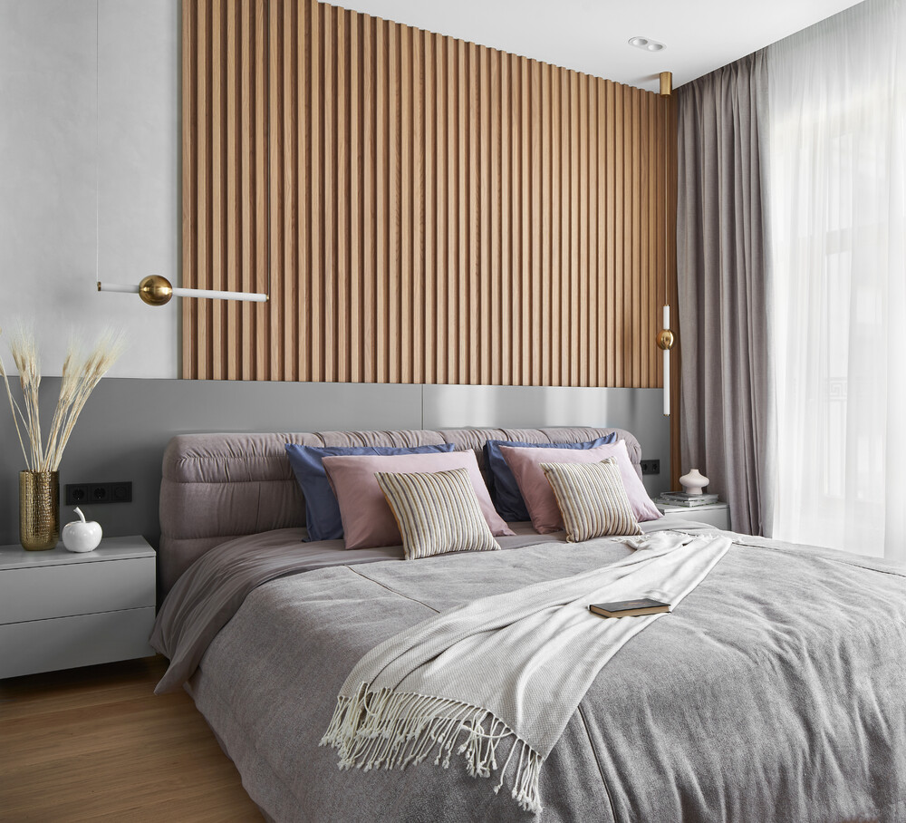 Интерьер спальни построен на спокойных цветах и вертикальных линиях. У изголовья кровати установлена панель из деревянных ламелей, которая задает масштаб всей комнате.