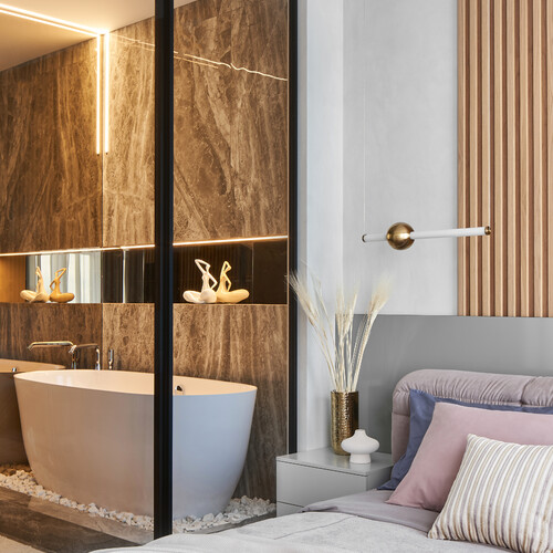 По бокам стоят тумбы, а сверху закреплены подвесные светильники с деталями из латуни. Ванную комнату отделяет перегородка из прозрачного стекла в черном профиле. Сама ванна стоит на подиуме с декоративными камнями, а стены облицованы крупной плиткой с фактурой.