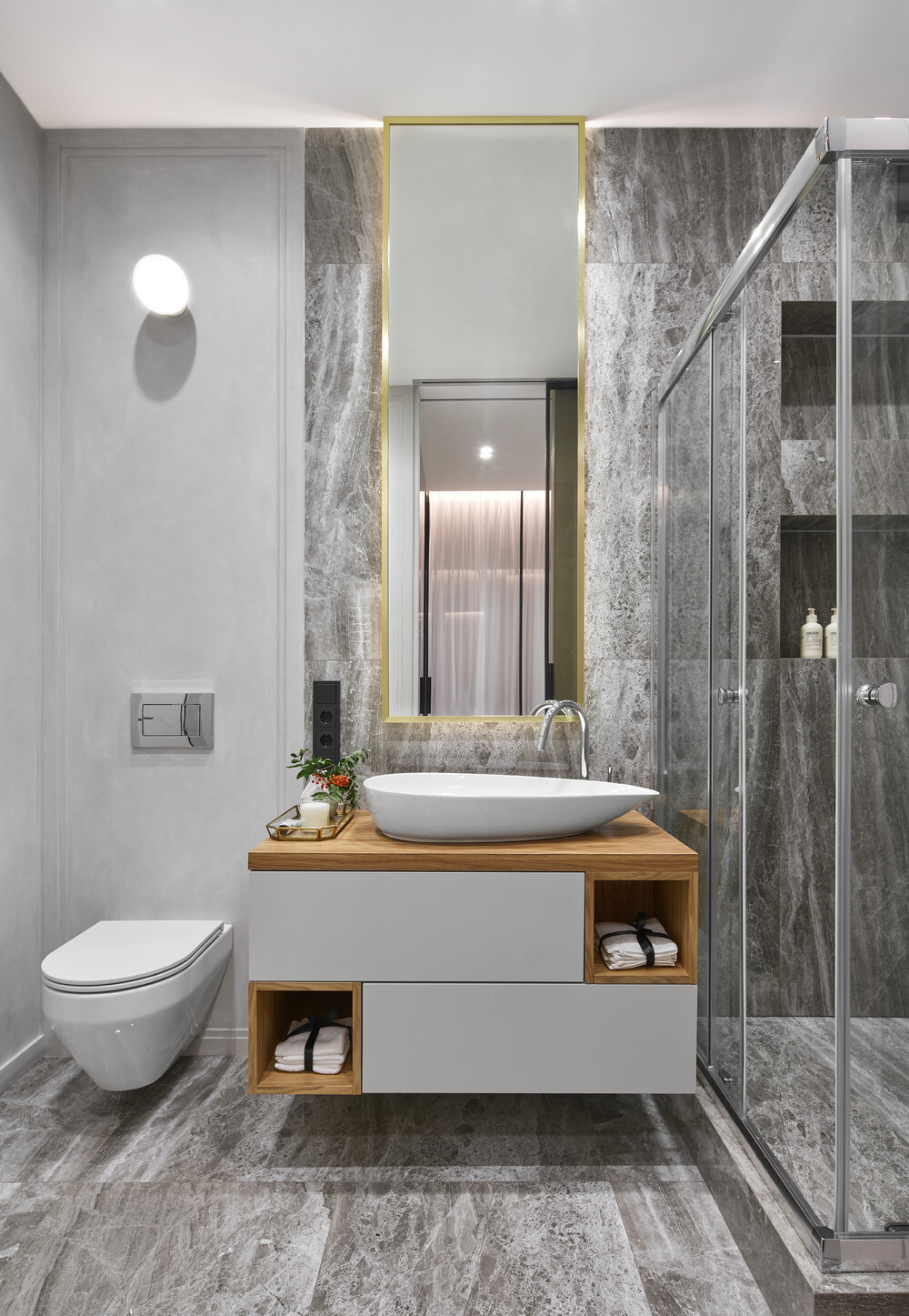 Керамогранит с каменной текстурой — использован в санузле и акцентных зонах, отличается практичностью и устойчивостью.