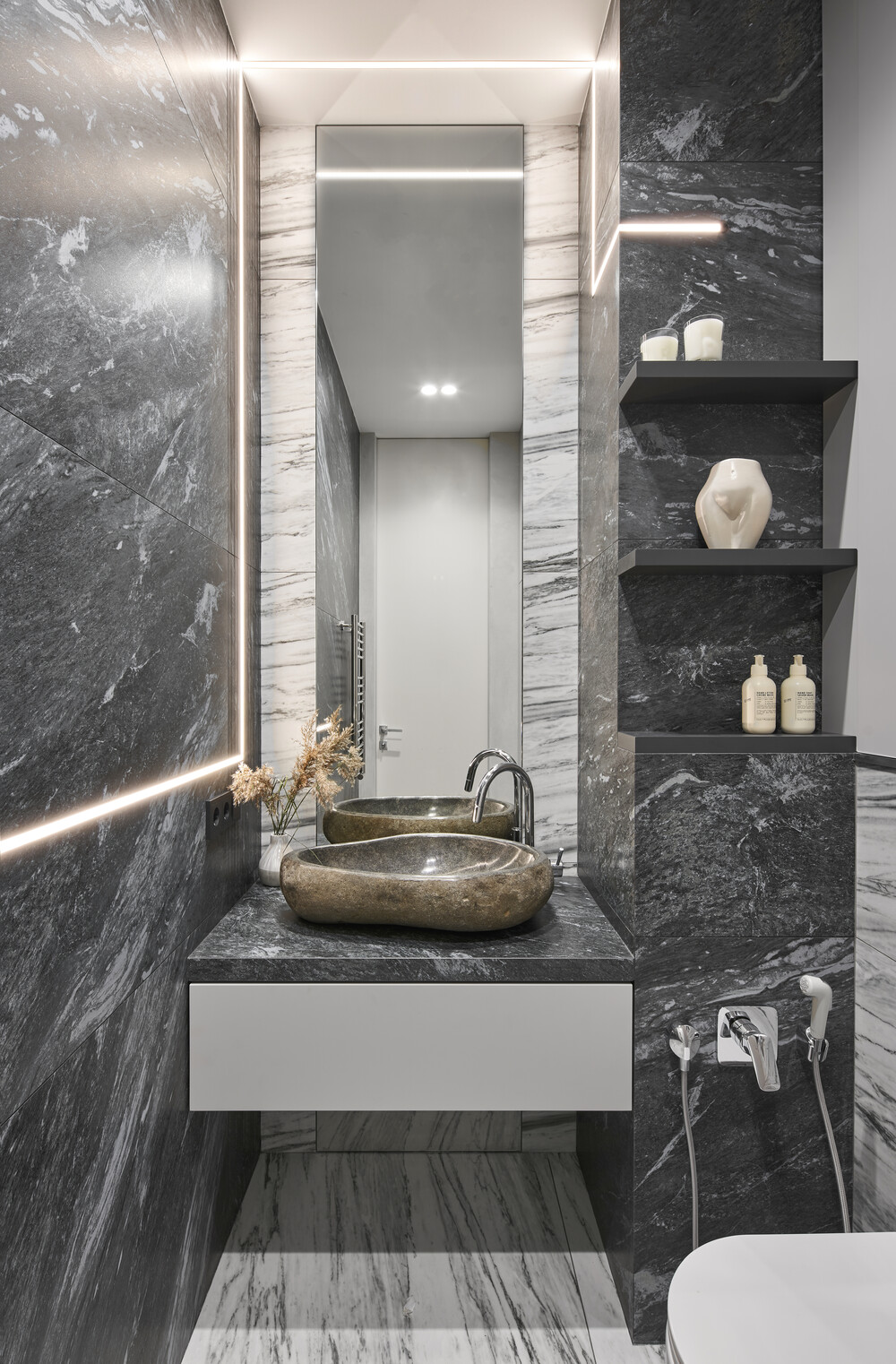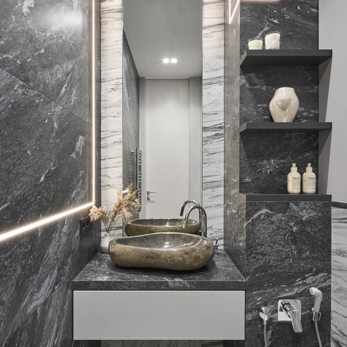 В первом санузле мы использовали темные каменные плиты с грубой фактурой. Раковина из цельного природного камня стала главным акцентом в этом помещении. По периметру зеркала и вдоль стен встроена диодная подсветка для мягкого освещения.