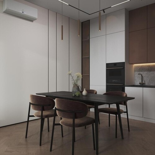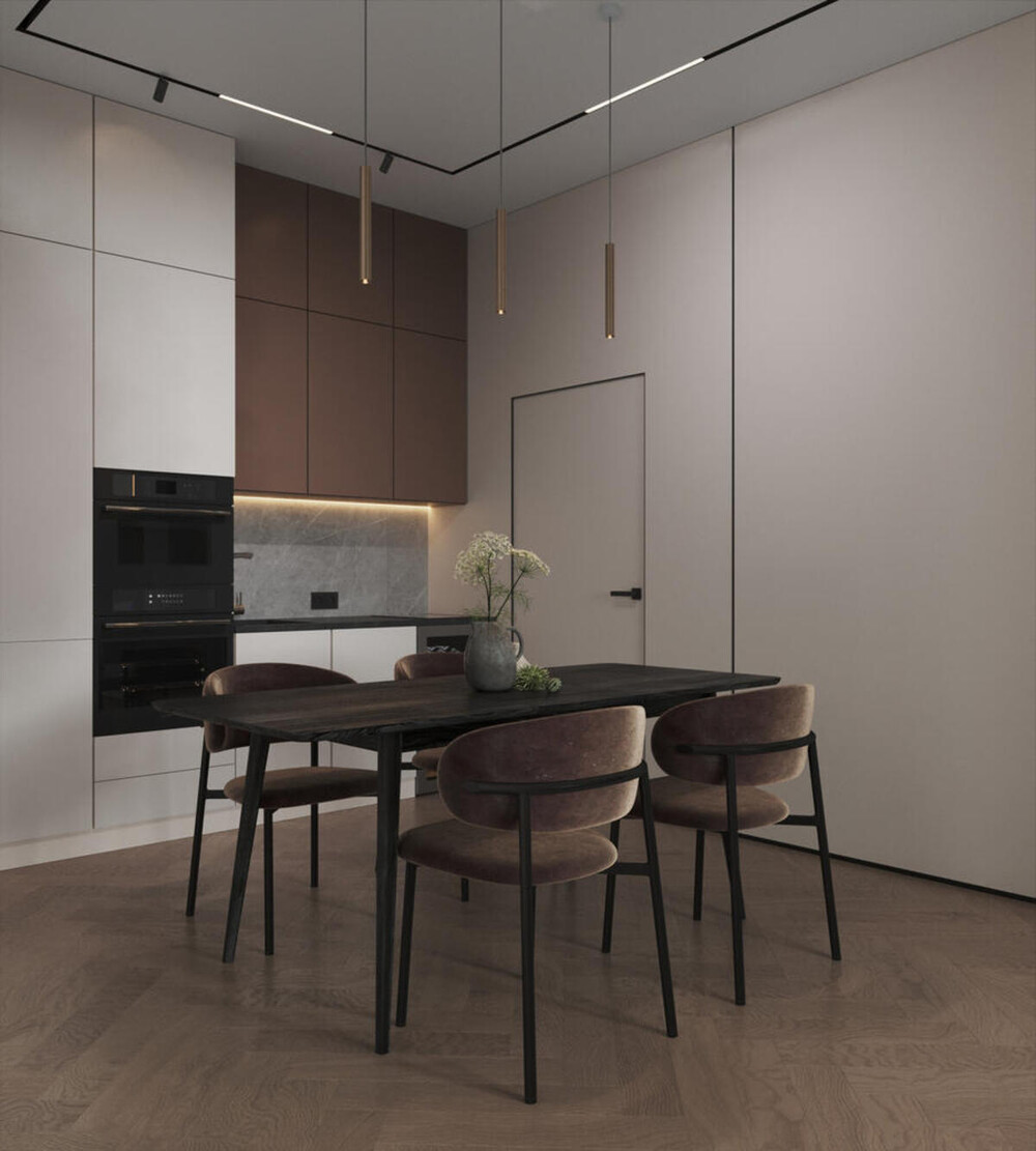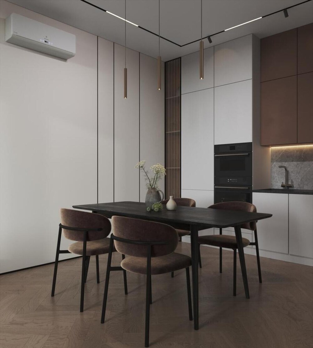 Основой стал теплый минимализм, где строгость линий компенсируется мягкими природными оттенками. База собрана из песочных, бежевых и серых тонов, которые дополнены глубоким коричневым деревом в мебели и декоре. Черные графичные акценты в виде светильников и сантехники добавляют интерьеру завершенности.