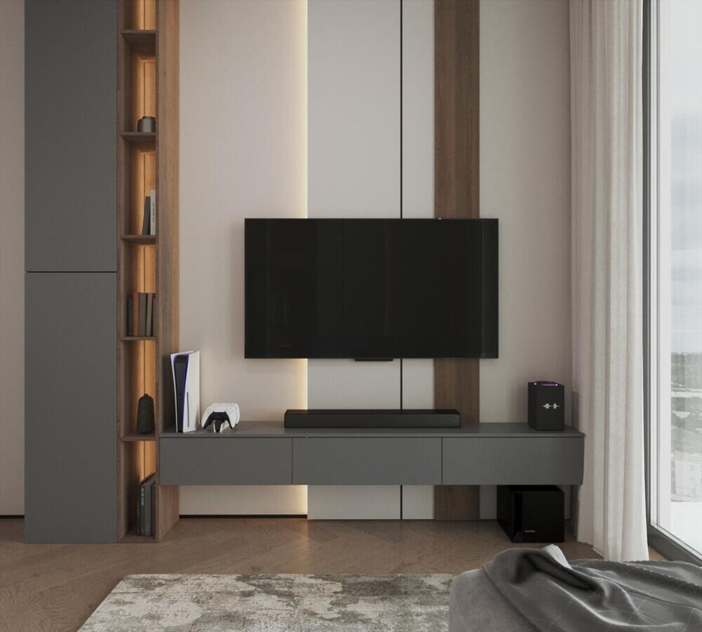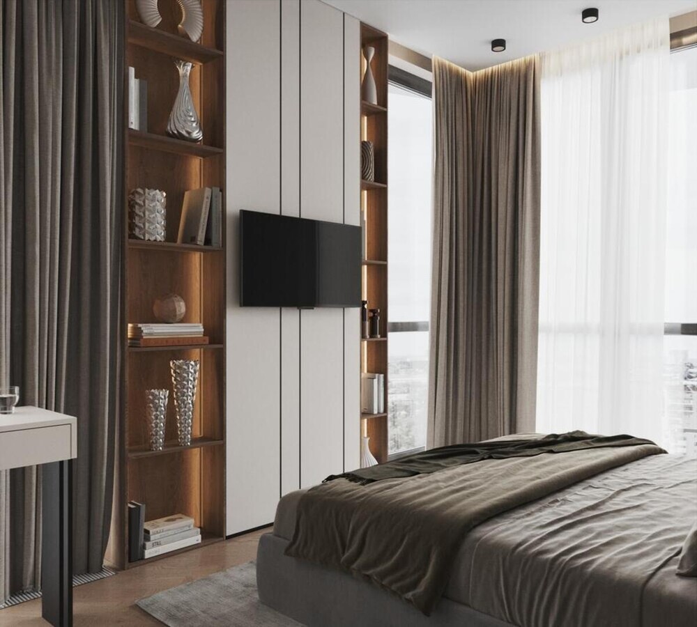 Напротив спального места расположили ТВ-зону с открытыми узкими стеллажами, полки которых подсвечены мягким теплым светом.