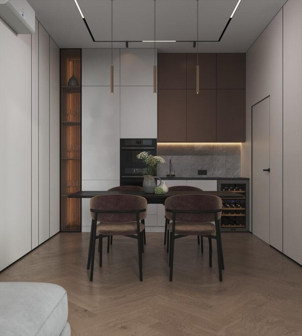 Интегрировать в кухонную зону винный шкаф и полный комплект бытовой техники.
