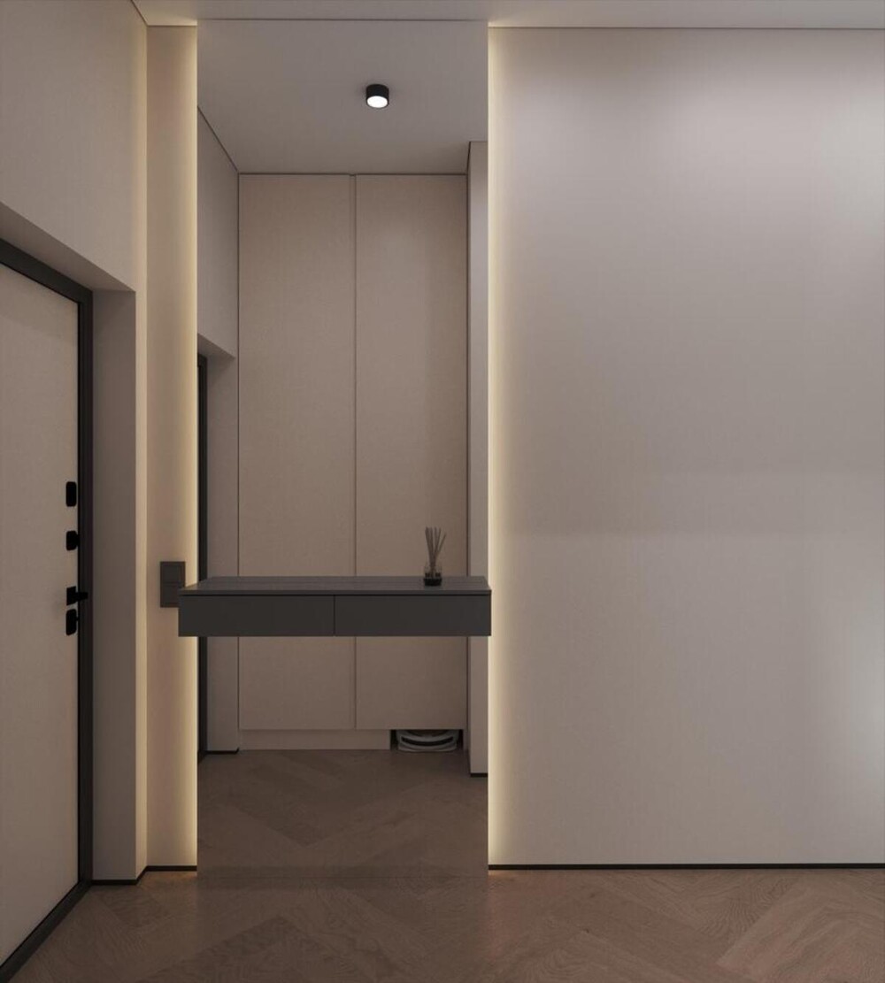 Черные дверные ручки и фурнитура стали графичными деталями на нейтральном фоне. Возле входа поставили простую консоль для ключей и мелочей, сохранив проход свободным. Комбинированный свет из точечных светильников и контурных лент делает прихожую светлой и визуально более просторной.