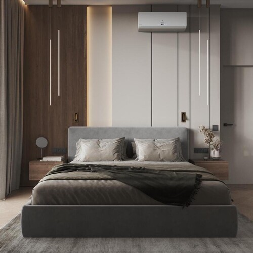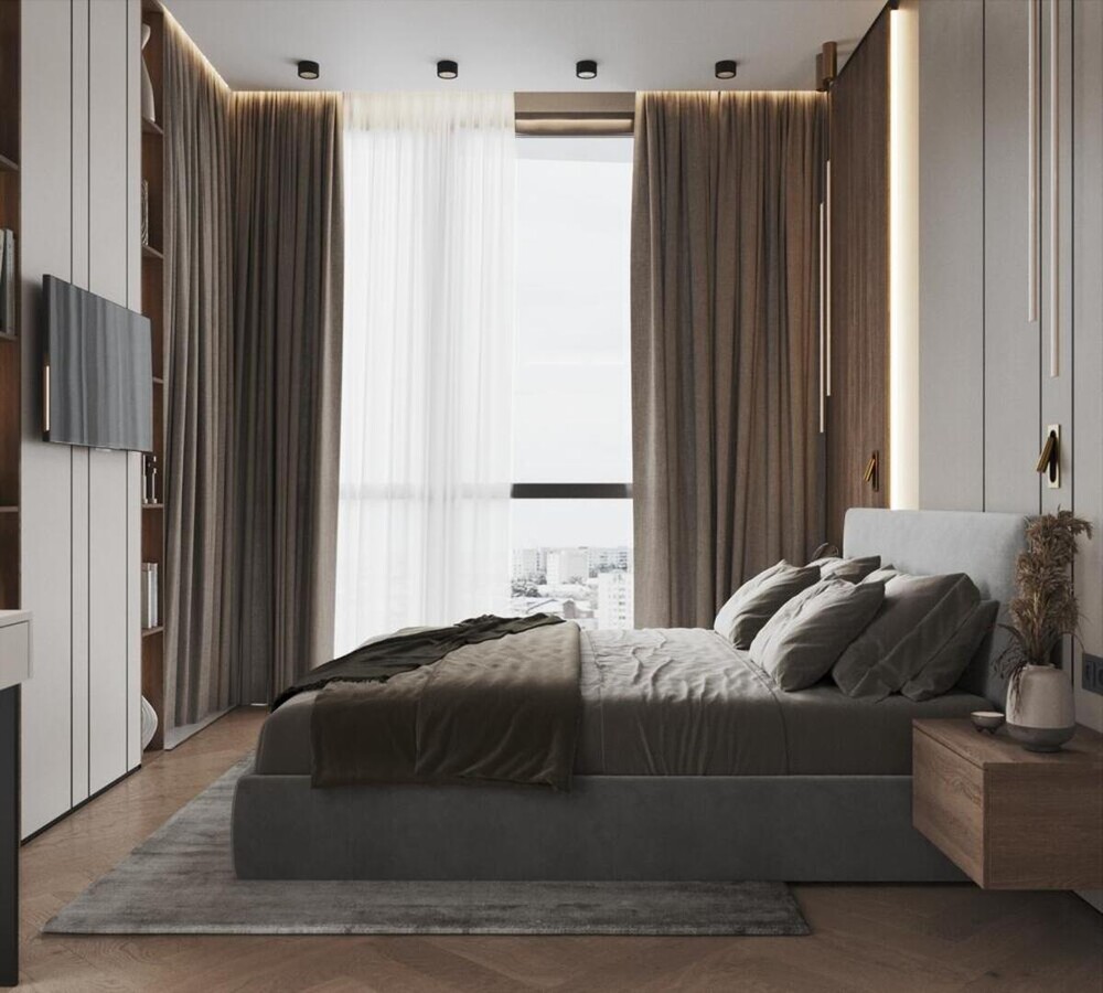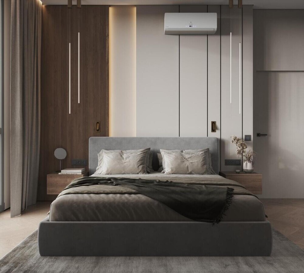 В центре комнаты установлена кровать с мягким серым изголовьем, дополненная лаконичными подвесными тумбами из дерева. Стену за кроватью оформили комбинацией из вертикальных шпонированных панелей и гладких поверхностей с интегрированными световыми линиями.